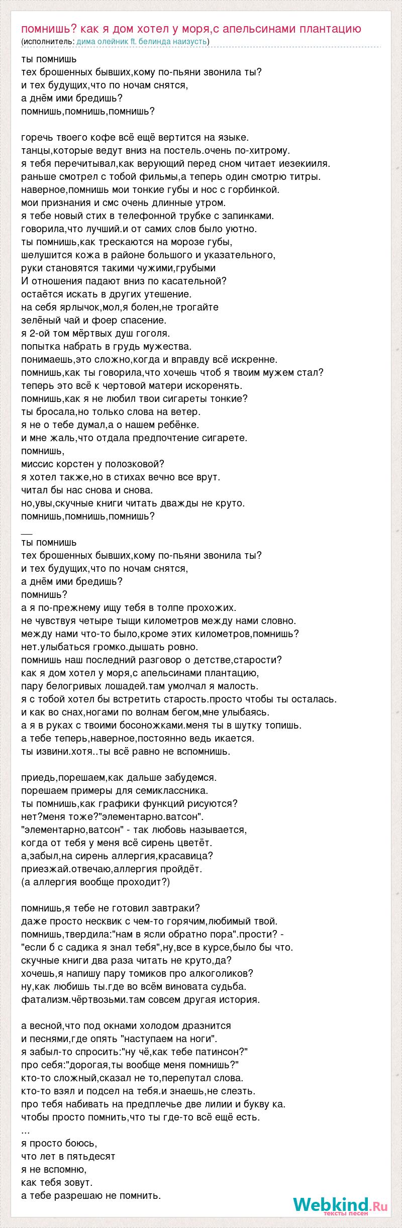 Главная→Исполнители→Дима олейник ft. белинда наизусть→Помнишь? как я дом хотел у моря,с апельсинами плантацию