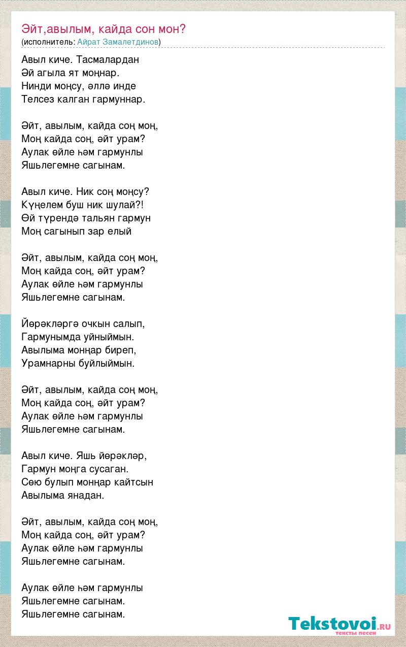 Авыл киче. Тасмалардан Әй агыла ят моңнар. Нинди моңсу, әллә инде Телсез калган гармуннар. Әйт, авылым, кайда соң моң, Моң кайда соң, әйт урам? Аулак өйле һәм гармунлы Яшьлегемне сагынам. Авыл киче. Ник соң моңсу? Күңелем буш ник шулай?! Өй түрендә тальян гармун Моң сагынып зар елый Әйт, авылым, кайда соң моң, Моң кайда соң, әйт урам? Аулак өйле һәм гармунлы Яшьлегемне сагынам. Йөрәкләргә очкын салып, Гармунымда уйныймын. Авылыма монңар биреп, Урамнарны буйлыймын. Әйт, авылым, кайда соң моң, Моң кайда соң, әйт урам? Аулак өйле һәм гармунлы Яшьлегемне сагынам. Авыл киче. Яшь йөрәкләр, Гармун моңга сусаган. Сөю булып монңар кайтсын Авылыма янадан. Әйт, авылым, кайда соң моң, Моң кайда соң, әйт урам? Аулак өйле һәм гармунлы Яшьлегемне сагынам. Аулак өйле һәм гармунлы Яшьлегемне сагынам. Яшьлегемне сагынам.