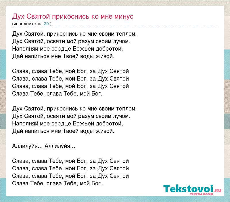 Дух Святой, прикоснись ко мне своим теплом. Дух Святой, освяти мой разум своим лучом. Наполняй мое сердце Божьей добротой, Дай напиться мне Твоей воды живой. Слава, слава Тебе, мой Бог, за Дух Святой Слава, слава Тебе, мой Бог, за Дух Святой Слава, слава Тебе, мой Бог, за Дух Святой Слава Тебе, слава Тебе, мой Бог. Дух Святой, прикоснись ко мне своим теплом. Дух Святой, освяти мой разум своим лучом. Наполняй мое сердце Божьей добротой, Дай напиться мне Твоей воды живой. Аллилуйя... Аллилуйя... Слава, слава Тебе, мой Бог, за Дух Святой Слава, слава Тебе, мой Бог, за Дух Святой Слава, слава Тебе, мой Бог, за Дух Святой Слава Тебе, слава Тебе, мой Бог.