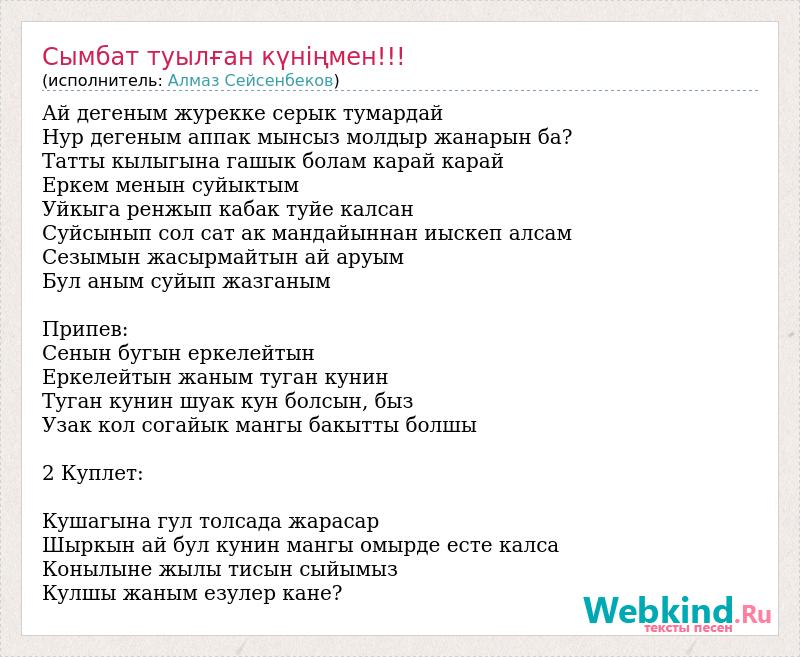 Ай дегеным журекке серык тумардай Нур дегеным аппак мынсыз молдыр жанарын ба? Татты кылыгына гашык болам карай карай Еркем менын суйыктым Уйкыга ренжып кабак туйе калсан Суйсынып сол сат ак мандайыннан иыскеп алсам Сезымын жасырмайтын ай аруым Бул аным суйып жазганым Припев: Сенын бугын еркелейтын Еркелейтын жаным туган кунин Туган кунин шуак кун болсын, быз Узак кол согайык мангы бакытты болшы 2 Куплет: Кушагына гул толсада жарасар Шыркын ай бул кунин мангы омырде есте калса Конылыне жылы тисын сыйымыз Кулшы жаным езулер кане?