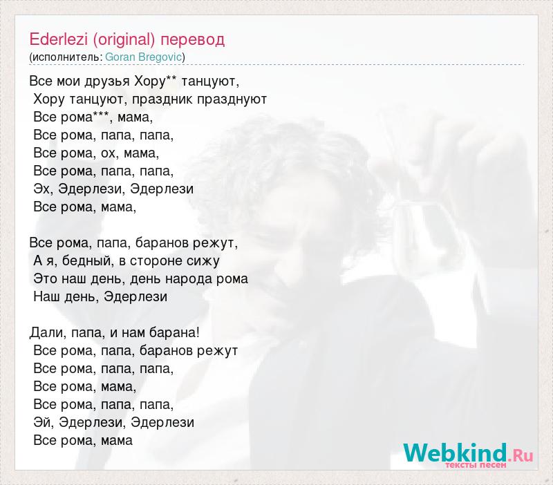 Все мои друзья Хору** танцуют, Хору танцуют, праздник празднуют Все рома***, мама, Все рома, папа, папа, Все рома, ох, мама, Все рома, папа, папа, Эх, Эдерлези, Эдерлези Все рома, мама, Все рома, папа, баранов режут, А я, бедный, в стороне сижу Это наш день, день народа рома Наш день, Эдерлези Дали, папа, и нам барана! Все рома, папа, баранов режут Все рома, папа, папа, Все рома, мама, Все рома, папа, папа, Эй, Эдерлези, Эдерлези Все рома, мама