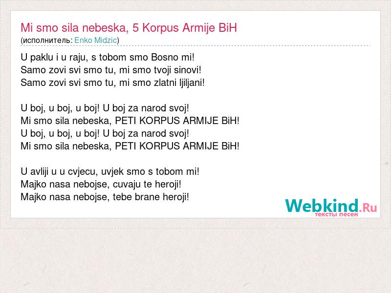 U paklu i u raju, s tobom smo Bosno mi! Samo zovi svi smo tu, mi smo tvoji sinovi! Samo zovi svi smo tu, mi smo zlatni ljiljani! U boj, u boj, u boj! U boj za narod svoj! Mi smo sila nebeska, PETI KORPUS ARMIJE BiH! U boj, u boj, u boj! U boj za narod svoj! Mi smo sila nebeska, PETI KORPUS ARMIJE BiH! U avliji u u cvjecu, uvjek smo s tobom mi! Majko nasa nebojse, cuvaju te heroji! Majko nasa nebojse, tebe brane heroji!