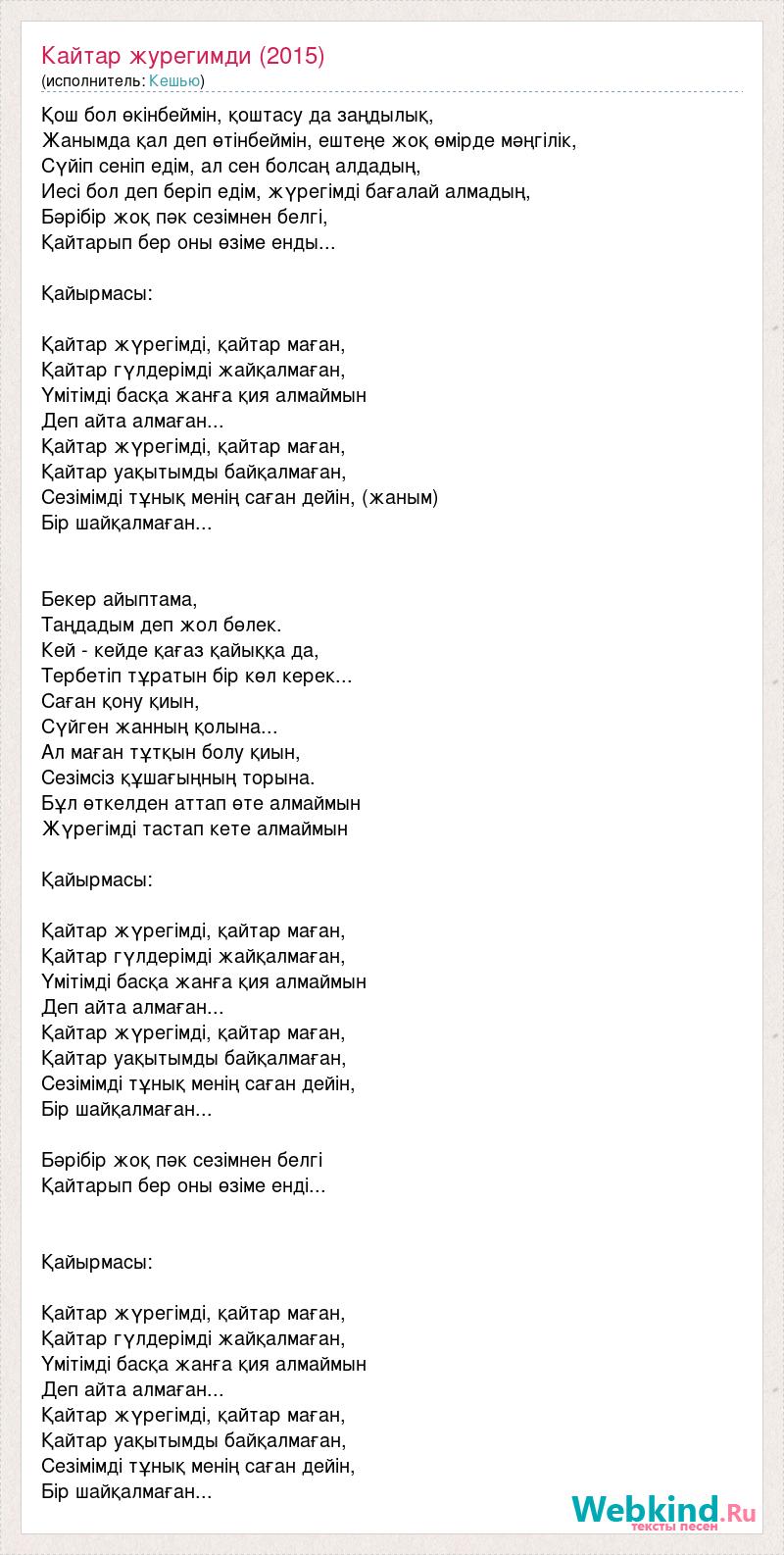 Қош бол өкінбеймін, қоштасу да заңдылық, Жанымда қал деп өтінбеймін, ештеңе жоқ өмірде мәңгілік, Сүйіп сеніп едім, ал сен болсаң алдадың, Иесі бол деп беріп едім, жүрегімді бағалай алмадың, Бәрібір жоқ пәк сезімнен белгі, Қайтарып бер оны өзіме енды... Қайырмасы: Қайтар жүрегімді, қайтар маған, Қайтар гүлдерімді жайқалмаған, Үмітімді басқа жанға қия алмаймын Деп айта алмаған... Қайтар жүрегімді, қайтар маған, Қайтар уақытымды байқалмаған, Сезімімді тұнық менің саған дейін, (жаным) Бір шайқалмаған... Бекер айыптама, Таңдадым деп жол бөлек. Кей - кейде қағаз қайыққа да, Тербетіп тұратын бір көл керек... Саған қону қиын, Сүйген жанның қолына... Ал маған тұтқын болу қиын, Сезімсіз құшағыңның торына. Бұл өткелден аттап өте алмаймын Жүрегімді тастап кете алмаймын Қайырмасы: Қайтар жүрегімді, қайтар маған, Қайтар гүлдерімді жайқалмаған, Үмітімді басқа жанға қия алмаймын Деп айта алмаған... Қайтар жүрегімді, қайтар маған, Қайтар уақытымды байқалмаған, Сезімімді тұнық менің саған дейін, Бір шайқалмаған... Бәрібір жоқ пәк сезімнен белгі Қайтарып бер оны өзіме енді... Қайырмасы: Қайтар жүрегімді, қайтар маған, Қайтар гүлдерімді жайқалмаған, Үмітімді басқа жанға қия алмаймын Деп айта алмаған... Қайтар жүрегімді, қайтар маған, Қайтар уақытымды байқалмаған, Сезімімді тұнық менің саған дейін, Бір шайқалмаған...