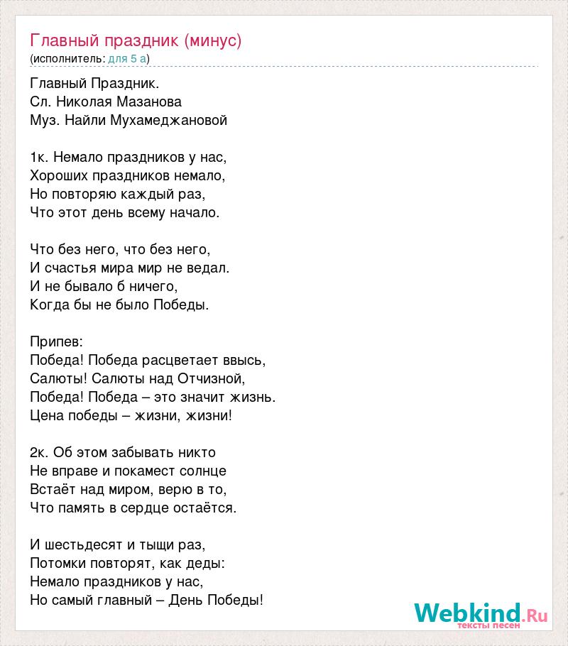 Главный Праздник. Сл. Николая Мазанова Муз. Найли Мухамеджановой 1к. Немало праздников у нас, Хороших праздников немало, Но повторяю каждый раз, Что этот день всему начало. Что без него, что без него, И счастья мира мир не ведал. И не бывало б ничего, Когда бы не было Победы. Припев: Победа! Победа расцветает ввысь, Салюты! Салюты над Отчизной, Победа! Победа – это значит жизнь. Цена победы – жизни, жизни! 2к. Об этом забывать никто Не вправе и покамест солнце Встаёт над миром, верю в то, Что память в сердце остаётся. И шестьдесят и тыщи раз, Потомки повторят, как деды: Немало праздников у нас, Но самый главный – День Победы!