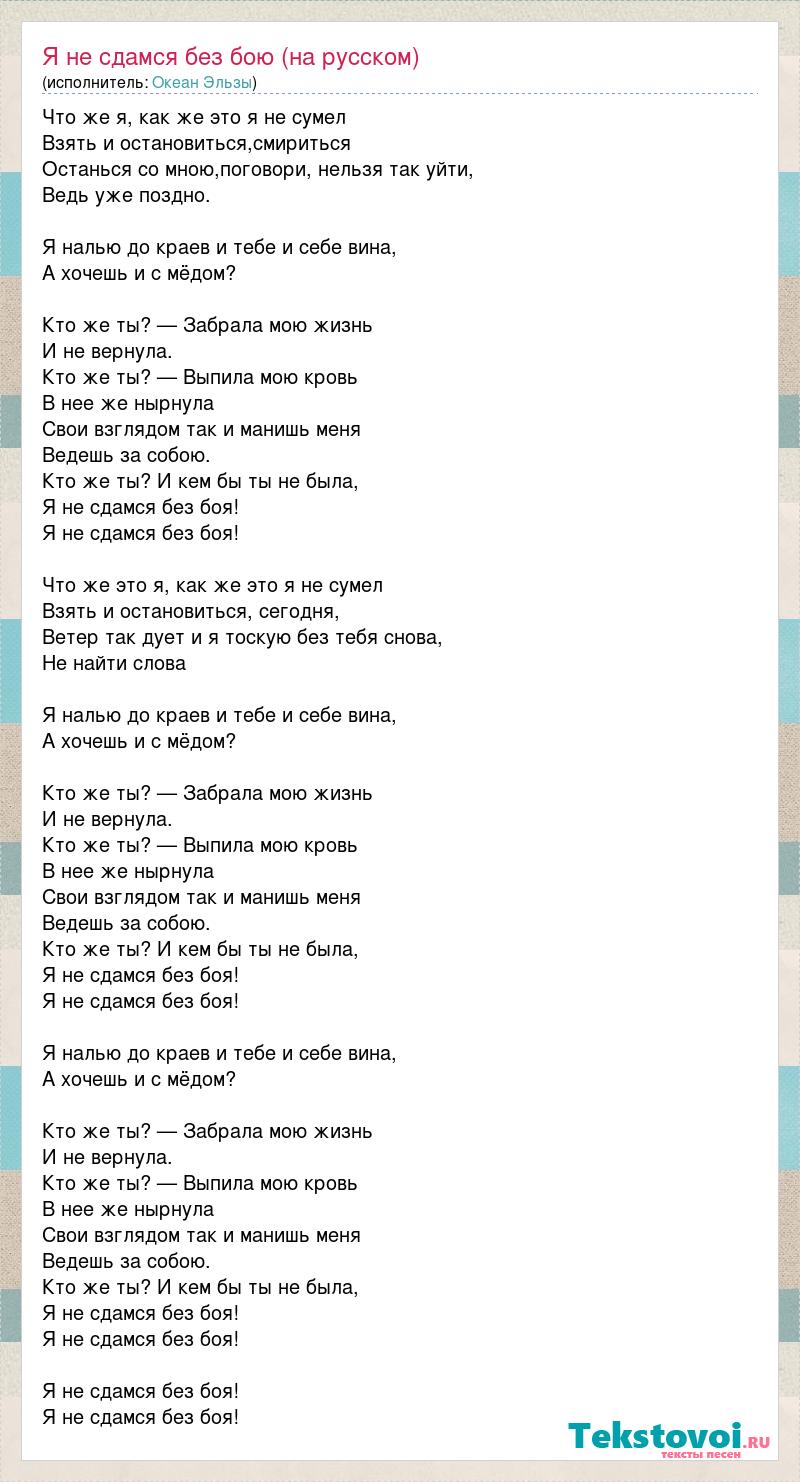 Что же я, как же это я не сумел Взять и остановиться,смириться Останься со мною,поговори, нельзя так уйти, Ведь уже поздно. Я налью до краев и тебе и себе вина, А хочешь и с мёдом? Кто же ты? — Забрала мою жизнь И не вернула. Кто же ты? — Выпила мою кровь В нее же нырнула Свои взглядом так и манишь меня Ведешь за собою. Кто же ты? И кем бы ты не была, Я не сдамся без боя! Я не сдамся без боя! Что же это я, как же это я не сумел Взять и остановиться, сегодня, Ветер так дует и я тоскую без тебя снова, Не найти слова Я налью до краев и тебе и себе вина, А хочешь и с мёдом? Кто же ты? — Забрала мою жизнь И не вернула. Кто же ты? — Выпила мою кровь В нее же нырнула Свои взглядом так и манишь меня Ведешь за собою. Кто же ты? И кем бы ты не была, Я не сдамся без боя! Я не сдамся без боя! Я налью до краев и тебе и себе вина, А хочешь и с мёдом? Кто же ты? — Забрала мою жизнь И не вернула. Кто же ты? — Выпила мою кровь В нее же нырнула Свои взглядом так и манишь меня Ведешь за собою. Кто же ты? И кем бы ты не была, Я не сдамся без боя! Я не сдамся без боя! Я не сдамся без боя! Я не сдамся без боя!