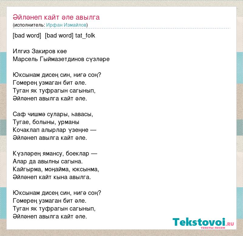 [bad word] [bad word] tat_folk Илгиз Закиров көе Марсель Гыймазетдинов сүзләре Юксынам дисең син, нигә соң? Гомерең узмаган бит әле. Туган як туфрагын сагынып, Әйләнеп авылга кайт әле. Саф чишмә сулары, һавасы, Тугае, болыны, урманы Кочаклап алырлар үзеңне — Әйләнеп авылга кайт әле. Күзләрең ямансу, боеклар — Алар да авылны сагына. Кайгырма, моңайма, юксынма, Әйләнеп кайт кына авылга. Юксынам дисең син, нигә соң? Гомерең узмаган бит әле. Туган як туфрагын сагынып, Әйләнеп авылга кайт әле.