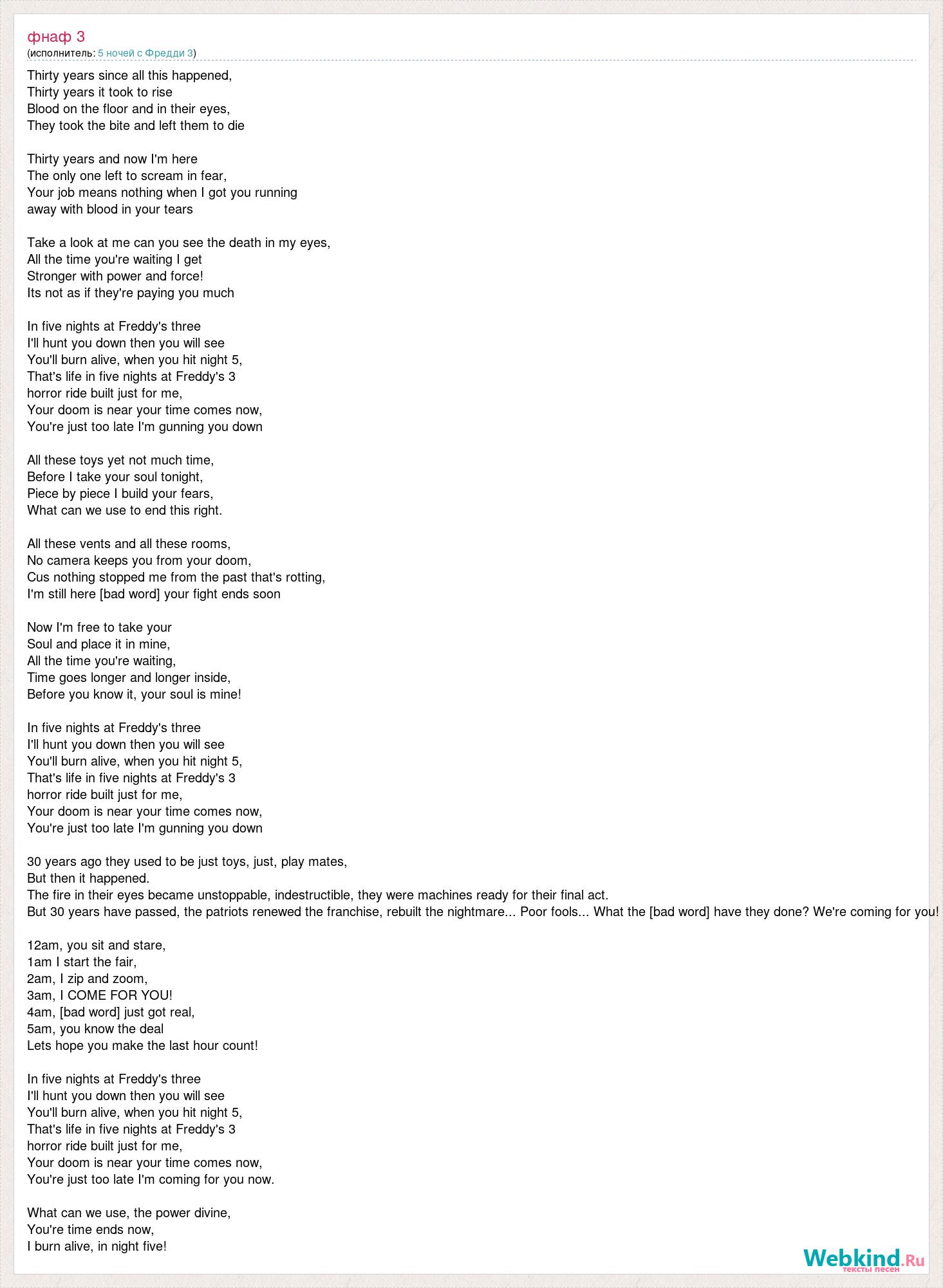 Thirty years since all this happened, Thirty years it took to rise Blood on the floor and in their eyes, They took the bite and left them to die Thirty years and now I'm here The only one left to scream in fear, Your job means nothing when I got you running away with blood in your tears Take a look at me can you see the death in my eyes, All the time you're waiting I get Stronger with power and force! Its not as if they're paying you much In five nights at Freddy's three I'll hunt you down then you will see You'll burn alive, when you hit night 5, That's life in five nights at Freddy's 3 horror ride built just for me, Your doom is near your time comes now, You're just too late I'm gunning you down All these toys yet not much time, Before I take your soul tonight, Piece by piece I build your fears, What can we use to end this right. All these vents and all these rooms, No camera keeps you from your doom, Cus nothing stopped me from the past that's rotting, I'm still here [bad word] your fight ends soon Now I'm free to take your Soul and place it in mine, All the time you're waiting, Time goes longer and longer inside, Before you know it, your soul is mine! In five nights at Freddy's three I'll hunt you down then you will see You'll burn alive, when you hit night 5, That's life in five nights at Freddy's 3 horror ride built just for me, Your doom is near your time comes now, You're just too late I'm gunning you down 30 years ago they used to be just toys, just, play mates, But then it happened. The fire in their eyes became unstoppable, indestructible, they were machines ready for their final act. But 30 years have passed, the patriots renewed the franchise, rebuilt the nightmare... Poor fools... What the [bad word] have they done? We're coming for you! 12am, you sit and stare, 1am I start the fair, 2am, I zip and zoom, 3am, I COME FOR YOU! 4am, [bad word] just got real, 5am, you know the deal Lets hope you make the last hour count! In five nights at Freddy's three I'll hunt you down then you will see You'll burn alive, when you hit night 5, That's life in five nights at Freddy's 3 horror ride built just for me, Your doom is near your time comes now, You're just too late I'm coming for you now. What can we use, the power divine, You're time ends now, I burn alive, in night five!