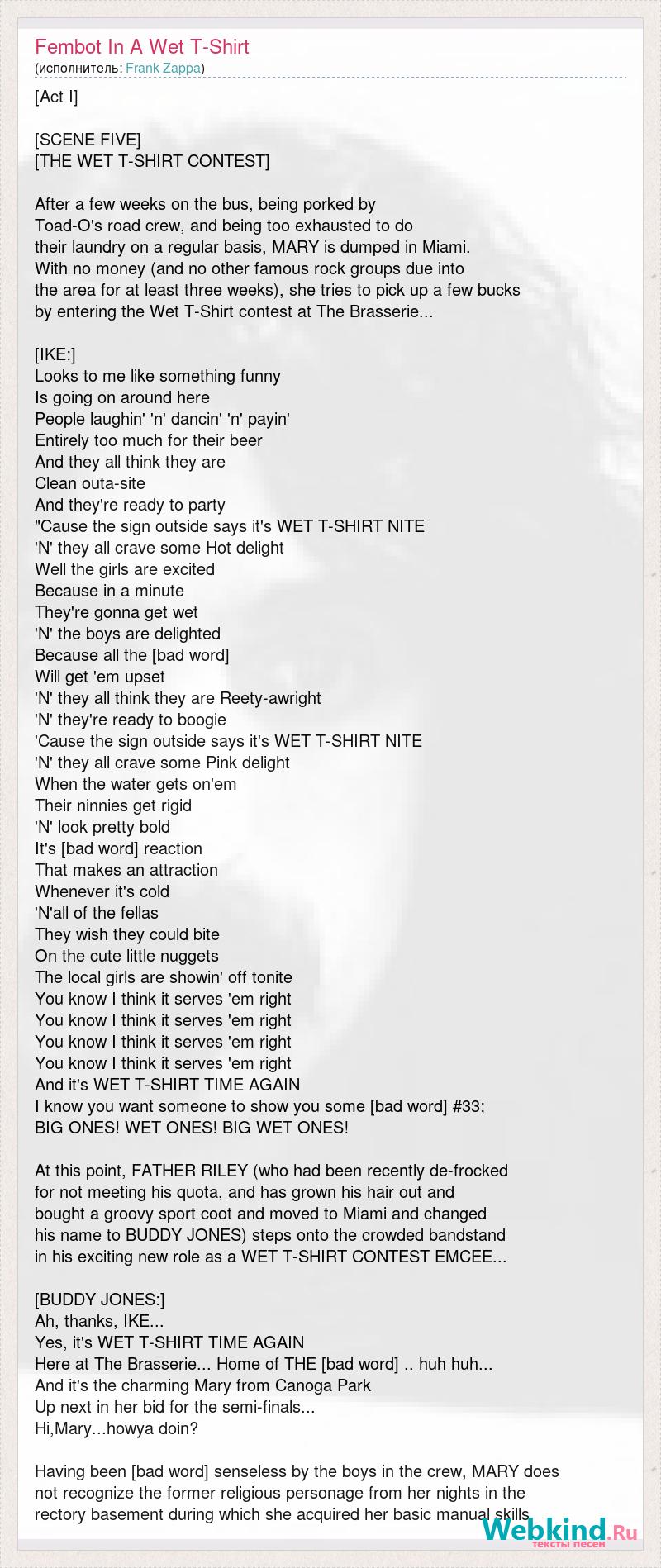 [Act I] [SCENE FIVE] [THE WET T-SHIRT CONTEST] After a few weeks on the bus, being porked by Toad-O's road crew, and being too exhausted to do their laundry on a regular basis, MARY is dumped in Miami. With no money (and no other famous rock groups due into the area for at least three weeks), she tries to pick up a few bucks by entering the Wet T-Shirt contest at The Brasserie... [IKE:] Looks to me like something funny Is going on around here People laughin' 'n' dancin' 'n' payin' Entirely too much for their beer And they all think they are Clean outa-site And they're ready to party "Cause the sign outside says it's WET T-SHIRT NITE 'N' they all crave some Hot delight Well the girls are excited Because in a minute They're gonna get wet 'N' the boys are delighted Because all the [bad word] Will get 'em upset 'N' they all think they are Reety-awright 'N' they're ready to boogie 'Cause the sign outside says it's WET T-SHIRT NITE 'N' they all crave some Pink delight When the water gets on'em Their ninnies get rigid 'N' look pretty bold It's [bad word] reaction That makes an attraction Whenever it's cold 'N'all of the fellas They wish they could bite On the cute little nuggets The local girls are showin' off tonite You know I think it serves 'em right You know I think it serves 'em right You know I think it serves 'em right You know I think it serves 'em right And it's WET T-SHIRT TIME AGAIN I know you want someone to show you some [bad word] #33; BIG ONES! WET ONES! BIG WET ONES! At this point, FATHER RILEY (who had been recently de-frocked for not meeting his quota, and has grown his hair out and bought a groovy sport coot and moved to Miami and changed his name to BUDDY JONES) steps onto the crowded bandstand in his exciting new role as a WET T-SHIRT CONTEST EMCEE... [BUDDY JONES:] Ah, thanks, IKE... Yes, it's WET T-SHIRT TIME AGAIN Here at The Brasserie... Home of THE [bad word] .. huh huh... And it's the charming Mary from Canoga Park Up next in her bid for the semi-finals... Hi,Mary...howya doin? Having been [bad word] senseless by the boys in the crew, MARY does not recognize the former religious personage from her nights in the rectory basement during which she acquired her basic manual skills