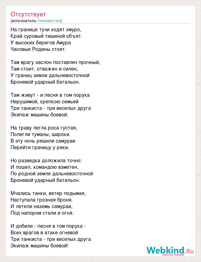 На границе тучи ходят хмуро, Край суровый тишиной объят. У высоких берегов Амура Часовые Родины стоят. Там врагу заслон поставлен прочный, Там стоит, отважен и силен, У границ земли дальневосточной Броневой ударный батальон. Там живут - и песня в том порука Нерушимой, крепкою семьей Три танкиста - три веселых друга Экипаж машины боевой. На траву легла роса густая, Полегли туманы, широки. В эту ночь решили самураи Перейти границу у реки. Но разведка доложила точно: И пошел, командою взметен, По родной земле дальневосточной Броневой ударный батальон. Мчались танки, ветер подымая, Наступала грозная броня. И летели наземь самураи, Под напором стали и огня. И добили - песня в том порука - Всех врагов в атаке огневой Три танкиста - три веселых друга Экипаж машины боевой!
