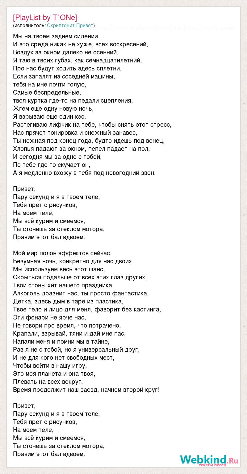 Мы на твоем заднем сидении, И это среда никак не хуже, всех воскресений, Воздух за окном далеко не осенний, Я таю в твоих губах, как семнадцатилетний, Про нас будут ходить здесь сплетни, Если запалят из соседней машины, тебя на мне почти голую, Самые беспредельные, твоя куртка где-то на педали сцепления, Жгем еще одну новую ночь, Я взрываю еще один кэс, Растегиваю лифчик на тебе, чтобы снять этот стресс, Нас прячет тонировка и снежный занавес, Ты нежная под конец года, будто идешь под венец, Хлопья падают за окном, пепел падает на пол, И сегодня мы за одно с тобой, По тебе где то скучает он, А я медленно вхожу в тебя под новогодний звон. Привет, Пару секунд и я в твоем теле, Тебя прет с рисунков, На моем теле, Мы всё курим и смеемся, Ты стонешь за стеклом мотора, Правим этот бал вдвоем. Мой мир полон эффектов сейчас, Безумная ночь, конкретно для нас двоих, Мы используем весь этот шанс, Скрыться подальше от всех этих глаз других, Твои стоны хит нашего праздника, Алкоголь дразнит нас, ты просто фантастика, Детка, здесь дым в таре из пластика, Твое тело и лицо для меня, фаворит без кастинга, Эти фонари не ярче нас, Не говори про время, что потрачено, Крапали, взрывай, тяни и дай мне пас, Напали меня и помни мы в тайне, Раз я не с тобой, но я универсальный друг, И не для кого нет свободных мест, Чтобы войти в нашу игру, Это моя планета и она твоя, Плевать на всех вокруг, Время продолжит наш заезд, начнем второй круг! Привет, Пару секунд и я в твоем теле, Тебя прет с рисунков, На моем теле, Мы всё курим и смеемся, Ты стонешь за стеклом мотора, Правим этот бал вдвоем.