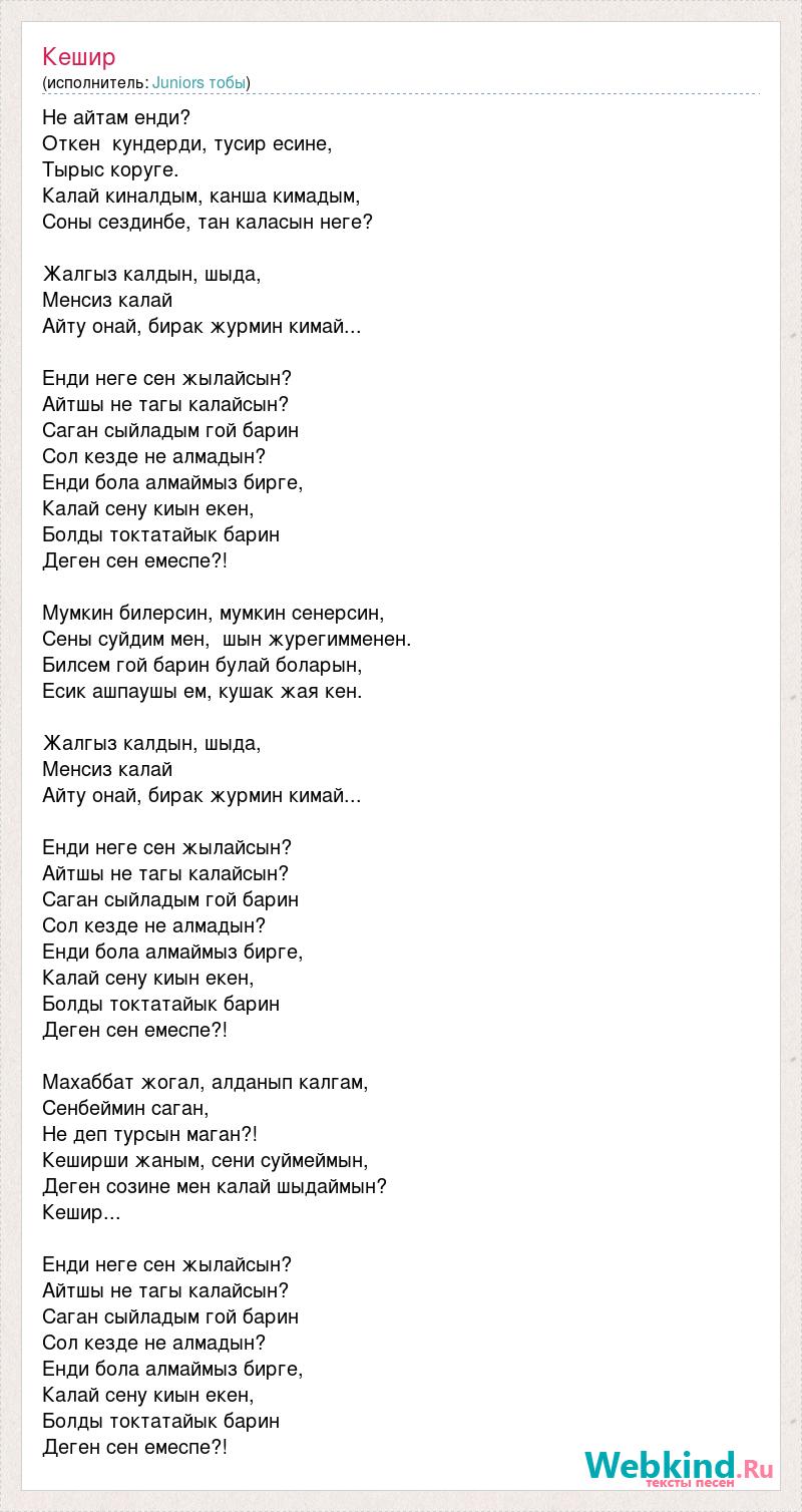 Не айтам енди? Откен кундерди, тусир есине, Тырыс коруге. Калай киналдым, канша кимадым, Соны сездинбе, тан каласын неге? Жалгыз калдын, шыда, Менсиз калай Айту онай, бирак журмин кимай... Енди неге сен жылайсын? Айтшы не тагы калайсын? Саган сыйладым гой барин Сол кезде не алмадын? Енди бола алмаймыз бирге, Калай сену киын екен, Болды токтатайык барин Деген сен емеспе?! Мумкин билерсин, мумкин сенерсин, Сены суйдим мен, шын журегимменен. Билсем гой барин булай боларын, Есик ашпаушы ем, кушак жая кен. Жалгыз калдын, шыда, Менсиз калай Айту онай, бирак журмин кимай... Енди неге сен жылайсын? Айтшы не тагы калайсын? Саган сыйладым гой барин Сол кезде не алмадын? Енди бола алмаймыз бирге, Калай сену киын екен, Болды токтатайык барин Деген сен емеспе?! Махаббат жогал, алданып калгам, Сенбеймин саган, Не деп турсын маган?! Кеширши жаным, сени суймеймын, Деген созине мен калай шыдаймын? Кешир... Енди неге сен жылайсын? Айтшы не тагы калайсын? Саган сыйладым гой барин Сол кезде не алмадын? Енди бола алмаймыз бирге, Калай сену киын екен, Болды токтатайык барин Деген сен емеспе?!