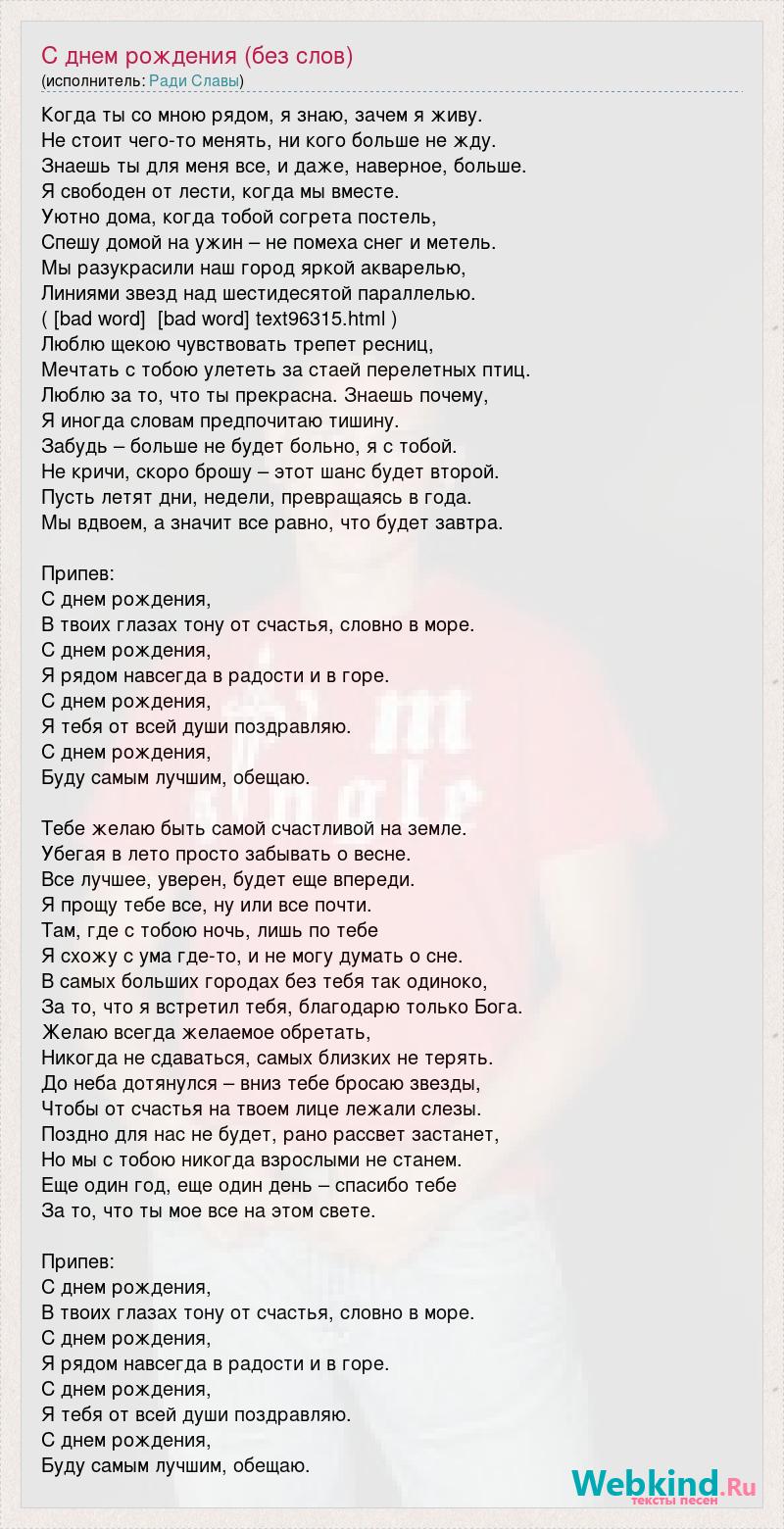 Когда ты со мною рядом, я знаю, зачем я живу. Не стоит чего-то менять, ни кого больше не жду. Знаешь ты для меня все, и даже, наверное, больше. Я свободен от лести, когда мы вместе. Уютно дома, когда тобой согрета постель, Спешу домой на ужин – не помеха снег и метель. Мы разукрасили наш город яркой акварелью, Линиями звезд над шестидесятой параллелью. ( [bad word] [bad word] text96315.html ) Люблю щекою чувствовать трепет ресниц, Мечтать с тобою улететь за стаей перелетных птиц. Люблю за то, что ты прекрасна. Знаешь почему, Я иногда словам предпочитаю тишину. Забудь – больше не будет больно, я с тобой. Не кричи, скоро брошу – этот шанс будет второй. Пусть летят дни, недели, превращаясь в года. Мы вдвоем, а значит все равно, что будет завтра. Припев: С днем рождения, В твоих глазах тону от счастья, словно в море. С днем рождения, Я рядом навсегда в радости и в горе. С днем рождения, Я тебя от всей души поздравляю. С днем рождения, Буду самым лучшим, обещаю. Тебе желаю быть самой счастливой на земле. Убегая в лето просто забывать о весне. Все лучшее, уверен, будет еще впереди. Я прощу тебе все, ну или все почти. Там, где с тобою ночь, лишь по тебе Я схожу с ума где-то, и не могу думать о сне. В самых больших городах без тебя так одиноко, За то, что я встретил тебя, благодарю только Бога. Желаю всегда желаемое обретать, Никогда не сдаваться, самых близких не терять. До неба дотянулся – вниз тебе бросаю звезды, Чтобы от счастья на твоем лице лежали слезы. Поздно для нас не будет, рано рассвет застанет, Но мы с тобою никогда взрослыми не станем. Еще один год, еще один день – спасибо тебе За то, что ты мое все на этом свете. Припев: С днем рождения, В твоих глазах тону от счастья, словно в море. С днем рождения, Я рядом навсегда в радости и в горе. С днем рождения, Я тебя от всей души поздравляю. С днем рождения, Буду самым лучшим, обещаю.