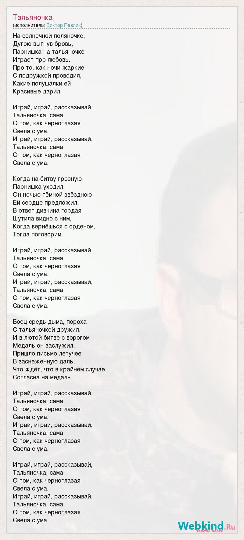 На солнечной поляночке, Дугою выгнув бровь, Парнишка на тальяночке Играет про любовь. Про то, как ночи жаркие С подружкой проводил, Какие полушалки ей Красивые дарил. Играй, играй, рассказывай, Тальяночка, сама О том, как черноглазая Свела с ума. Играй, играй, рассказывай, Тальяночка, сама О том, как черноглазая Свела с ума. Когда на битву грозную Парнишка уходил, Он ночью тёмной звёздною Ей сердце предложил. В ответ дивчина гордая Шутила видно с ним, Когда вернёшься с орденом, Тогда поговорим. Играй, играй, рассказывай, Тальяночка, сама О том, как черноглазая Свела с ума. Играй, играй, рассказывай, Тальяночка, сама О том, как черноглазая Свела с ума. Боец средь дыма, пороха С тальяночкой дружил. И в лютой битве с ворогом Медаль он заслужил. Пришло письмо летучее В заснеженную даль, Что ждёт, что в крайнем случае, Согласна на медаль. Играй, играй, рассказывай, Тальяночка, сама О том, как черноглазая Свела с ума. Играй, играй, рассказывай, Тальяночка, сама О том, как черноглазая Свела с ума. Играй, играй, рассказывай, Тальяночка, сама О том, как черноглазая Свела с ума. Играй, играй, рассказывай, Тальяночка, сама О том, как черноглазая Свела с ума.