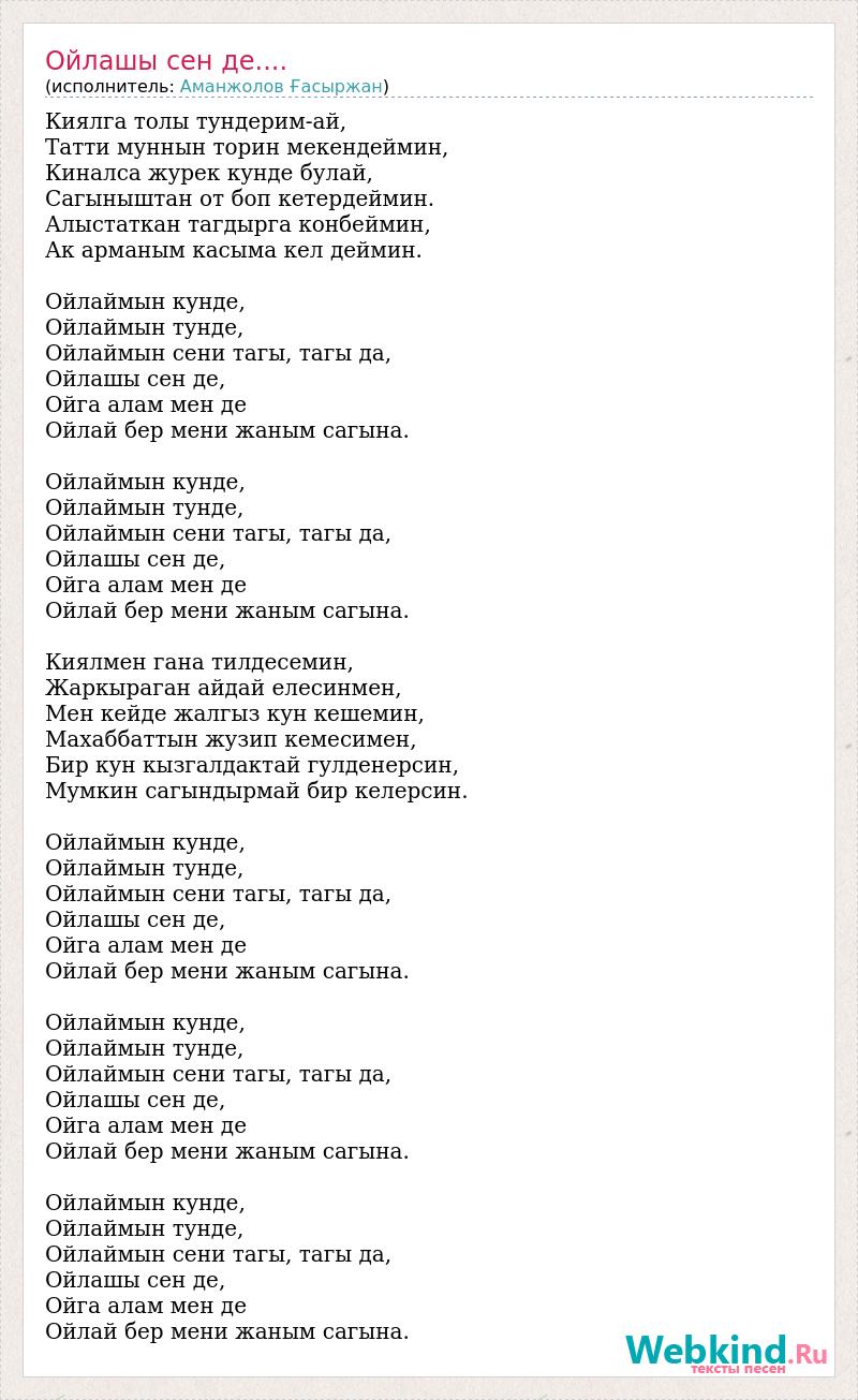 Киялга толы тундерим-ай, Татти муннын торин мекендеймин, Киналса журек кунде булай, Сагыныштан от боп кетердеймин. Алыстаткан тагдырга конбеймин, Ак арманым касыма кел деймин. Ойлаймын кунде, Ойлаймын тунде, Ойлаймын сени тагы, тагы да, Ойлашы сен де, Ойга алам мен де Ойлай бер мени жаным сагына. Ойлаймын кунде, Ойлаймын тунде, Ойлаймын сени тагы, тагы да, Ойлашы сен де, Ойга алам мен де Ойлай бер мени жаным сагына. Киялмен гана тилдесемин, Жаркыраган айдай елесинмен, Мен кейде жалгыз кун кешемин, Махаббаттын жузип кемесимен, Бир кун кызгалдактай гулденерсин, Мумкин сагындырмай бир келерсин. Ойлаймын кунде, Ойлаймын тунде, Ойлаймын сени тагы, тагы да, Ойлашы сен де, Ойга алам мен де Ойлай бер мени жаным сагына. Ойлаймын кунде, Ойлаймын тунде, Ойлаймын сени тагы, тагы да, Ойлашы сен де, Ойга алам мен де Ойлай бер мени жаным сагына. Ойлаймын кунде, Ойлаймын тунде, Ойлаймын сени тагы, тагы да, Ойлашы сен де, Ойга алам мен де Ойлай бер мени жаным сагына.
