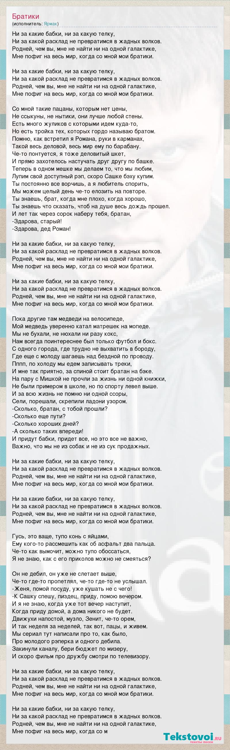 Ни за какие бабки, ни за какую телку, Ни за какой расклад не превратимся в жадных волков. Родней, чем вы, мне не найти ни на одной галактике, Мне пофиг на весь мир, когда со мной мои братики. Ни за какие бабки, ни за какую телку, Ни за какой расклад не превратимся в жадных волков. Родней, чем вы, мне не найти ни на одной галактике, Мне пофиг на весь мир, когда со мной мои братики. Со мной такие пацаны, которым нет цены, Не ссыкуны, не нытики, они лучше любой стены. Есть много жуликов с которыми идем куда-то, Но есть тройка тех, которых гордо называю братом. Помню, как встретил я Романа, руки в карманах, Такой весь деловой, весь мир ему по барабану. Че-то понтуется, я тоже деловитый шкет, И прямо захотелось настучать друг другу по башке. Теперь в одном мешке мы делаем то, что мы любим, Лупим свой доступный рэп, скоро Сашке бэху купим. Ты постоянно все ворчишь, а я любитель спорить, Мы можем целый день че-то елозить на повторе. Ты знаешь, брат, когда мне плохо, когда хорошо, Ты знаешь что сказать, чтоб на душе весь дождь прошел. И лет так через сорок наберу тебя, братан, -Здарова, старый! -Здарова, дед Роман! Ни за какие бабки, ни за какую телку, Ни за какой расклад не превратимся в жадных волков. Родней, чем вы, мне не найти ни на одной галактике, Мне пофиг на весь мир, когда со мной мои братики. Ни за какие бабки, ни за какую телку, Ни за какой расклад не превратимся в жадных волков. Родней, чем вы, мне не найти ни на одной галактике, Мне пофиг на весь мир, когда со мной мои братики. Пока другие там медведи на велосипеде, Мой медведь уверенно катал матрешек на мопеде. Мы не бухали, не нюхали ни разу кокс, Нам всегда поинтереснее был только футбол и бокс. С одного города, где трудно не выхватить в бороду, Где еще с молоду шагаешь над бездной по проводу. Пппп, по холоду мы едем записывать треки, И мне так приятно, за спиной стоит братан на бэке. На пару с Мишкой не прочли за жизнь ни одной книжки, Не были примером в школе, но по спорту левел выше. И за всю жизнь не помню ни одной ссоры, Сели, порешали, скрепили ладони узором. -Сколько, братан, с тобой прошли? -Сколько еще пути? -Сколько хороших дней? -А сколько таких впереди! И придут бабки, придет все, но это все не важно, Важно, что мы не из собак и не из сук продажных. Ни за какие бабки, ни за какую телку, Ни за какой расклад не превратимся в жадных волков. Родней, чем вы, мне не найти ни на одной галактике, Мне пофиг на весь мир, когда со мной мои братики. Ни за какие бабки, ни за какую телку, Ни за какой расклад не превратимся в жадных волков. Родней, чем вы, мне не найти ни на одной галактике, Мне пофиг на весь мир, когда со мной мои братики. Гусь, это ваще, тупо конь с яйцами, Ему кого-то рассмешить как об асфальт два пальца. Че-то как вымочит, можно тупо обоссаться, Я не знаю, как с его приколов можно не смеяться? Он не дебил, он уже не слетает выше, Че-то где-то пропетлял, че-то где-то не услышал. -Женя, помой посуду, уже кушать не с чего! -К Сашку спешу, пиздец, приду, помою вечером. И я не знаю, когда уже тот вечер наступит, Когда приду домой, а дома никого не будет. Движухи напостой, музло, Зенит, че-то орем, И так неделя за неделей, так вот, пацы, и живем. Мы сериал тут написали про то, как было, Про молодого рэперка и одного дебила. Закинули каналу, бери бюджет по мизеру, И скоро фильм про дружбу смотри по телевизору. Ни за какие бабки, ни за какую телку, Ни за какой р