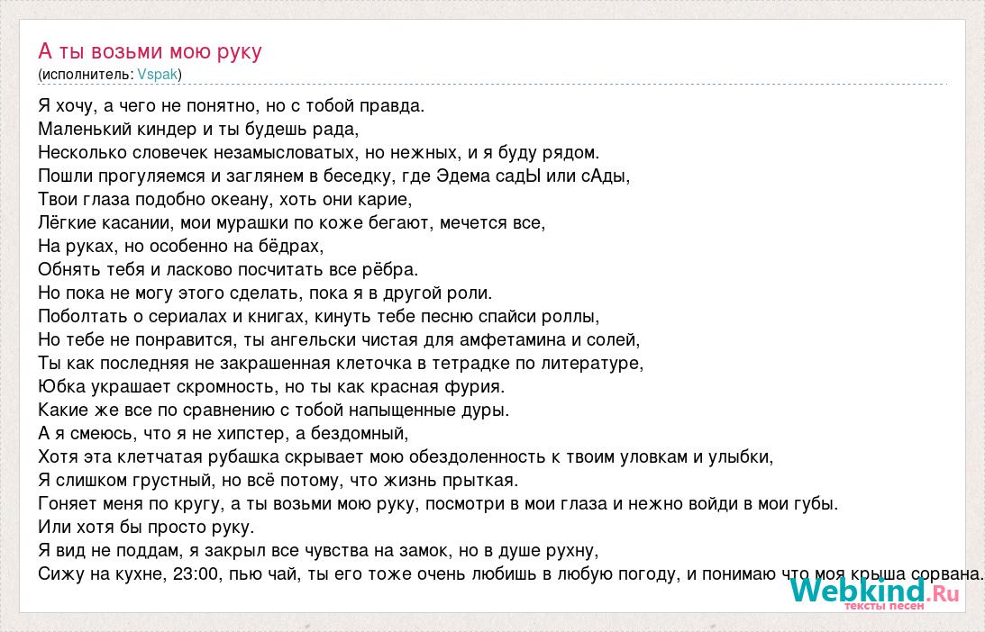 Я хочу, а чего не понятно, но с тобой правда. Маленький киндер и ты будешь рада, Несколько словечек незамысловатых, но нежных, и я буду рядом. Пошли прогуляемся и заглянем в беседку, где Эдема садЫ или сАды, Твои глаза подобно океану, хоть они карие, Лёгкие касании, мои мурашки по коже бегают, мечется все, На руках, но особенно на бёдрах, Обнять тебя и ласково посчитать все рёбра. Но пока не могу этого сделать, пока я в другой роли. Поболтать о сериалах и книгах, кинуть тебе песню спайси роллы, Но тебе не понравится, ты ангельски чистая для амфетамина и солей, Ты как последняя не закрашенная клеточка в тетрадке по литературе, Юбка украшает скромность, но ты как красная фурия. Какие же все по сравнению с тобой напыщенные дуры. А я смеюсь, что я не хипстер, а бездомный, Хотя эта клетчатая рубашка скрывает мою обездоленность к твоим уловкам и улыбки, Я слишком грустный, но всё потому, что жизнь прыткая. Гоняет меня по кругу, а ты возьми мою руку, посмотри в мои глаза и нежно войди в мои губы. Или хотя бы просто руку. Я вид не поддам, я закрыл все чувства на замок, но в душе рухну, Сижу на кухне, 23:00, пью чай, ты его тоже очень любишь в любую погоду, и понимаю что моя крыша сорвана.