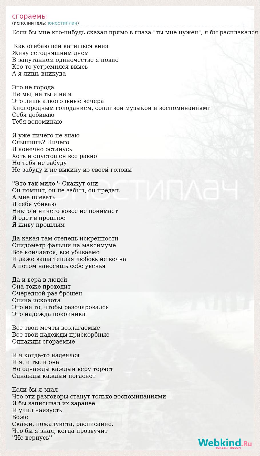 Если бы мне кто-нибудь сказал прямо в глаза "ты мне нужен", я бы расплакался Как огибающей катишься вниз Живу сегодняшним днем В запутанном одиночестве я повис Кто-то устремился ввысь А я лишь вникуда Это не города Не мы, не ты и не я Это лишь алкогольные вечера Кислородным голоданием, сопливой музыкой и воспоминаниями Себя добиваю Тебя вспоминаю Я уже ничего не знаю Слышишь? Ничего Я конечно останусь Хоть и опустошен все равно Но тебя не забуду Не забуду и не выкину из своей головы ''Это так мило''- Скажут они. Он помнит, он не забыл, он предан. А мне плевать Я себя убиваю Никто и ничего вовсе не понимает Я одет в прошлое Я живу прошлым Да какая там степень искренности Спидометр фальши на максимуме Все кончается, все убиваемо И даже ваша теплая любовь не вечна А потом наносишь себе увечья Да и вера в людей Она тоже проходит Очередной раз брошен Спина исколота Это не то, чтобы разочаровался Это надежда покойника Все твои мечты возлагаемые Все твои надежды прискорбные Однажды сгораемые И я когда-то надеялся И я, и ты, и она Но однажды каждый веру теряет Однажды каждый погаснет Если бы я знал Что эти разговоры станут только воспоминаниями Я бы записывал их заранее И учил наизусть Боже Скажи, пожалуйста, расписание. Что бы я знал, когда прозвучит ''Не вернусь''