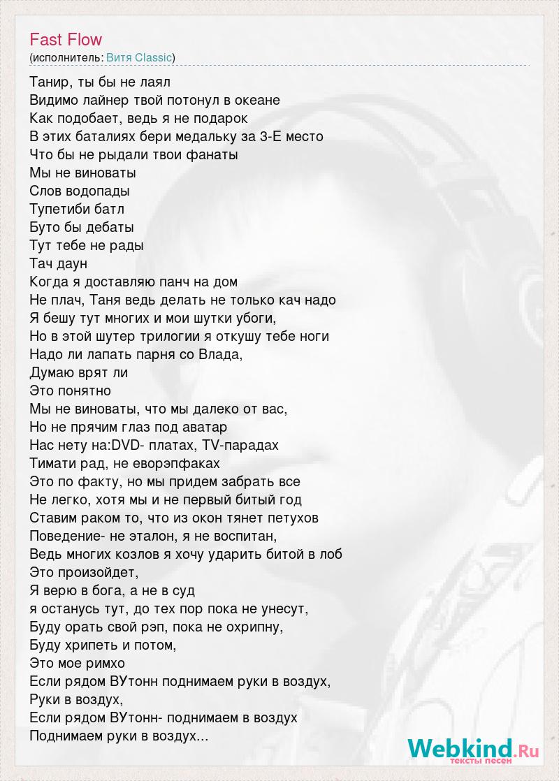 Танир, ты бы не лаял Видимо лайнер твой потонул в океане Как подобает, ведь я не подарок В этих баталиях бери медальку за 3-Е место Что бы не рыдали твои фанаты Мы не виноваты Слов водопады Тупетиби батл Буто бы дебаты Тут тебе не рады Тач даун Когда я доставляю панч на дом Не плач, Таня ведь делать не только кач надо Я бешу тут многих и мои шутки убоги, Но в этой шутер трилогии я откушу тебе ноги Надо ли лапать парня со Влада, Думаю врят ли Это понятно Мы не виноваты, что мы далеко от вас, Но не прячим глаз под аватар Нас нету на:DVD- платах, TV-парадах Тимати рад, не еворэпфаках Это по факту, но мы придем забрать все Не легко, хотя мы и не первый битый год Ставим раком то, что из окон тянет петухов Поведение- не эталон, я не воспитан, Ведь многих козлов я хочу ударить битой в лоб Это произойдет, Я верю в бога, а не в суд я останусь тут, до тех пор пока не унесут, Буду орать свой рэп, пока не охрипну, Буду хрипеть и потом, Это мое римхо Если рядом ВУтонн поднимаем руки в воздух, Руки в воздух, Если рядом ВУтонн- поднимаем в воздух Поднимаем руки в воздух...