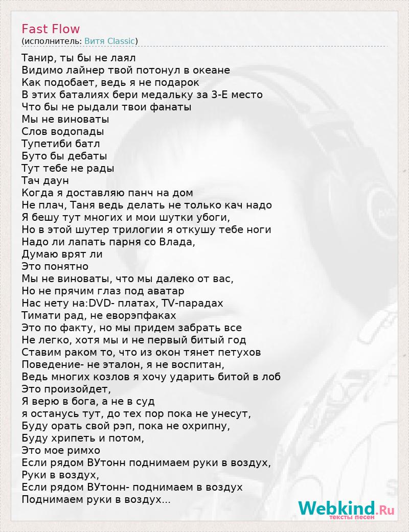 Танир, ты бы не лаял Видимо лайнер твой потонул в океане Как подобает, ведь я не подарок В этих баталиях бери медальку за 3-Е место Что бы не рыдали твои фанаты Мы не виноваты Слов водопады Тупетиби батл Буто бы дебаты Тут тебе не рады Тач даун Когда я доставляю панч на дом Не плач, Таня ведь делать не только кач надо Я бешу тут многих и мои шутки убоги, Но в этой шутер трилогии я откушу тебе ноги Надо ли лапать парня со Влада, Думаю врят ли Это понятно Мы не виноваты, что мы далеко от вас, Но не прячим глаз под аватар Нас нету на:DVD- платах, TV-парадах Тимати рад, не еворэпфаках Это по факту, но мы придем забрать все Не легко, хотя мы и не первый битый год Ставим раком то, что из окон тянет петухов Поведение- не эталон, я не воспитан, Ведь многих козлов я хочу ударить битой в лоб Это произойдет, Я верю в бога, а не в суд я останусь тут, до тех пор пока не унесут, Буду орать свой рэп, пока не охрипну, Буду хрипеть и потом, Это мое римхо Если рядом ВУтонн поднимаем руки в воздух, Руки в воздух, Если рядом ВУтонн- поднимаем в воздух Поднимаем руки в воздух...