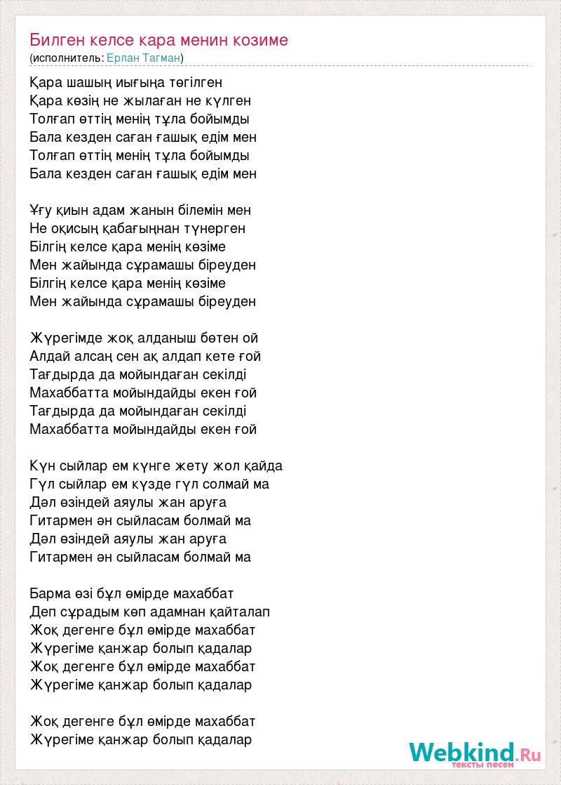 Қара шашың иығыңа төгілген Қара көзің не жылаған не күлген Толғап өттің менің тұла бойымды Бала кезден саған ғашық едім мен Толғап өттің менің тұла бойымды Бала кезден саған ғашық едім мен Ұғу қиын адам жанын білемін мен Не оқисың қабағыңнан түнерген Білгің келсе қара менің көзіме Мен жайында сұрамашы біреуден Білгің келсе қара менің көзіме Мен жайында сұрамашы біреуден Жүрегімде жоқ алданыш бөтен ой Алдай алсаң сен ақ алдап кете ғой Тағдырда да мойындаған секілді Махаббатта мойындайды екен ғой Тағдырда да мойындаған секілді Махаббатта мойындайды екен ғой Күн сыйлар ем күнге жету жол қайда Гүл сыйлар ем күзде гүл солмай ма Дәл өзіндей аяулы жан аруға Гитармен ән сыйласам болмай ма Дәл өзіндей аяулы жан аруға Гитармен ән сыйласам болмай ма Барма өзі бұл өмірде махаббат Деп сұрадым көп адамнан қайталап Жоқ дегенге бұл өмірде махаббат Жүрегіме қанжар болып қадалар Жоқ дегенге бұл өмірде махаббат Жүрегіме қанжар болып қадалар Жоқ дегенге бұл өмірде махаббат Жүрегіме қанжар болып қадалар