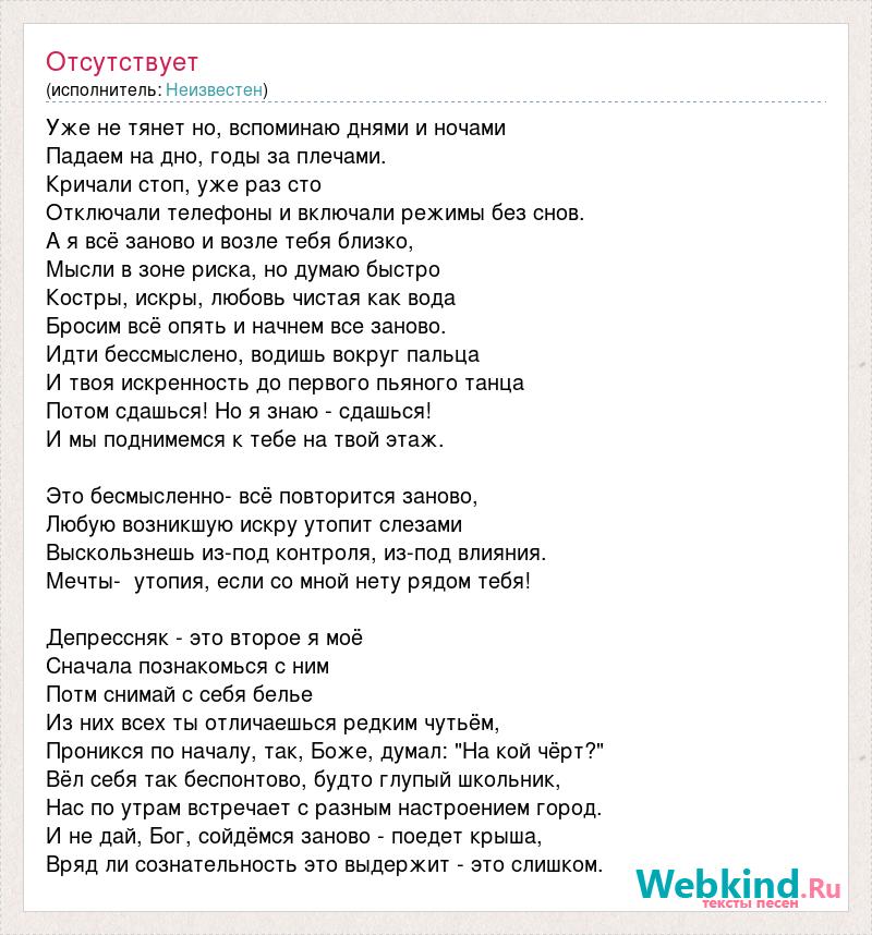Уже не тянет но, вспоминаю днями и ночами Падаем на дно, годы за плечами. Кричали стоп, уже раз сто Отключали телефоны и включали режимы без снов. А я всё заново и возле тебя близко, Мысли в зоне риска, но думаю быстро Костры, искры, любовь чистая как вода Бросим всё опять и начнем все заново. Идти бессмыслено, водишь вокруг пальца И твоя искренность до первого пьяного танца Потом сдашься! Но я знаю - сдашься! И мы поднимемся к тебе на твой этаж. Это бесмысленно- всё повторится заново, Любую возникшую искру утопит слезами Выскользнешь из-под контроля, из-под влияния. Мечты- утопия, если со мной нету рядом тебя! Депрессняк - это второе я моё Сначала познакомься с ним Потм снимай с себя белье Из них всех ты отличаешься редким чутьём, Проникся по началу, так, Боже, думал: "На кой чёрт?" Вёл себя так беспонтово, будто глупый школьник, Нас по утрам встречает с разным настроением город. И не дай, Бог, сойдёмся заново - поедет крыша, Вряд ли сознательность это выдержит - это слишком.