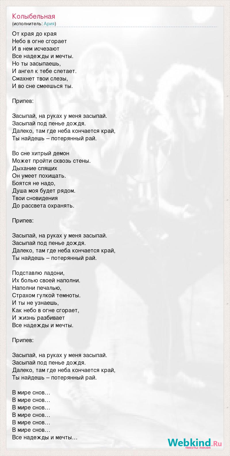 От края до края Небо в огне сгорает И в нем исчезают Все надежды и мечты. Но ты засыпаешь, И ангел к тебе слетает. Смахнет твои слезы, И во сне смеешься ты. Припев: Засыпай, на руках у меня засыпай. Засыпай под пенье дождя. Далеко, там где неба кончается край, Ты найдешь – потерянный рай. Во сне хитрый демон Может пройти сквозь стены. Дыхание спящих Он умеет похищать. Боятся не надо, Душа моя будет рядом. Твои сновидения До рассвета охранять. Припев: Засыпай, на руках у меня засыпай. Засыпай под пенье дождя. Далеко, там где неба кончается край, Ты найдешь – потерянный рай. Подставлю ладони, Их болью своей наполни. Наполни печалью, Страхом гулкой темноты. И ты не узнаешь, Как небо в огне сгорает, И жизнь разбивает Все надежды и мечты. Припев: Засыпай, на руках у меня засыпай. Засыпай под пенье дождя. Далеко, там где неба кончается край, Ты найдешь – потерянный рай. В мире снов… В мире снов… В мире снов… В мире снов… В мире снов… В мире снов… Все надежды и мечты…