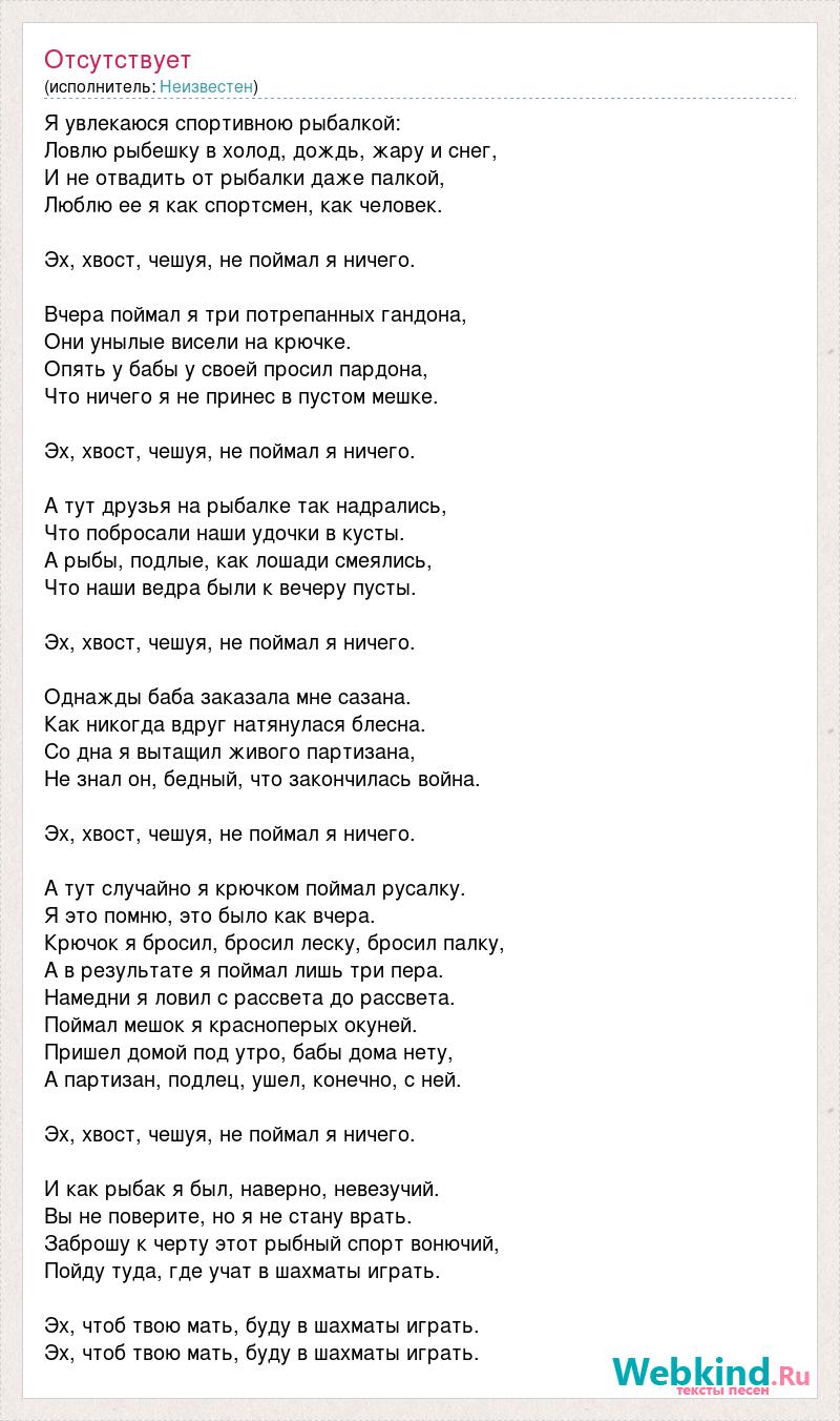 Я увлекаюся спортивною рыбалкой: Ловлю рыбешку в холод, дождь, жару и снег, И не отвадить от рыбалки даже палкой, Люблю ее я как спортсмен, как человек. Эх, хвост, чешуя, не поймал я ничего. Вчера поймал я три потрепанных гандона, Они унылые висели на крючке. Опять у бабы у своей просил пардона, Что ничего я не принес в пустом мешке. Эх, хвост, чешуя, не поймал я ничего. А тут друзья на рыбалке так надрались, Что побросали наши удочки в кусты. А рыбы, подлые, как лошади смеялись, Что наши ведра были к вечеру пусты. Эх, хвост, чешуя, не поймал я ничего. Однажды баба заказала мне сазана. Как никогда вдруг натянулася блесна. Со дна я вытащил живого партизана, Не знал он, бедный, что закончилась война. Эх, хвост, чешуя, не поймал я ничего. А тут случайно я крючком поймал русалку. Я это помню, это было как вчера. Крючок я бросил, бросил леску, бросил палку, А в результате я поймал лишь три пера. Намедни я ловил с рассвета до рассвета. Поймал мешок я красноперых окуней. Пришел домой под утро, бабы дома нету, А партизан, подлец, ушел, конечно, с ней. Эх, хвост, чешуя, не поймал я ничего. И как рыбак я был, наверно, невезучий. Вы не поверите, но я не стану врать. Заброшу к черту этот рыбный спорт вонючий, Пойду туда, где учат в шахматы играть. Эх, чтоб твою мать, буду в шахматы играть. Эх, чтоб твою мать, буду в шахматы играть.