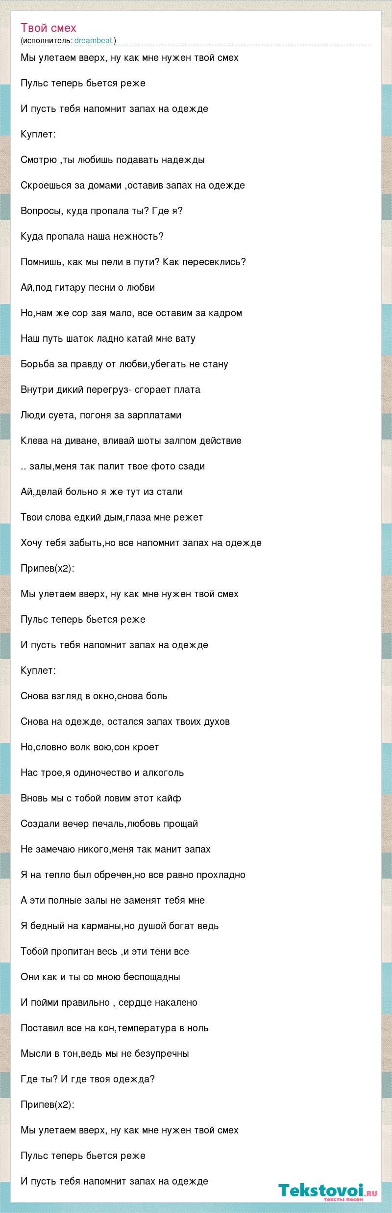 Мы улетаем вверх, ну как мне нужен твой смех Пульс теперь бьется реже И пусть тебя напомнит запах на одежде Куплет: Смотрю ,ты любишь подавать надежды Скроешься за домами ,оставив запах на одежде Вопросы, куда пропала ты? Где я? Куда пропала наша нежность? Помнишь, как мы пели в пути? Как пересеклись? Ай,под гитару песни о любви Но,нам же сор зая мало, все оставим за кадром Наш путь шаток ладно катай мне вату Борьба за правду от любви,убегать не стану Внутри дикий перегруз- сгорает плата Люди суета, погоня за зарплатами Клева на диване, вливай шоты залпом действие .. залы,меня так палит твое фото сзади Ай,делай больно я же тут из стали Твои слова едкий дым,глаза мне режет Хочу тебя забыть,но все напомнит запах на одежде Припев(х2): Мы улетаем вверх, ну как мне нужен твой смех Пульс теперь бьется реже И пусть тебя напомнит запах на одежде Куплет: Снова взгляд в окно,снова боль Снова на одежде, остался запах твоих духов Но,словно волк вою,сон кроет Нас трое,я одиночество и алкоголь Вновь мы с тобой ловим этот кайф Создали вечер печаль,любовь прощай Не замечаю никого,меня так манит запах Я на тепло был обречен,но все равно прохладно А эти полные залы не заменят тебя мне Я бедный на карманы,но душой богат ведь Тобой пропитан весь ,и эти тени все Они как и ты со мною беспощадны И пойми правильно , сердце накалено Поставил все на кон,температура в ноль Мысли в тон,ведь мы не безупречны Где ты? И где твоя одежда? Припев(х2): Мы улетаем вверх, ну как мне нужен твой смех Пульс теперь бьется реже И пусть тебя напомнит запах на одежде