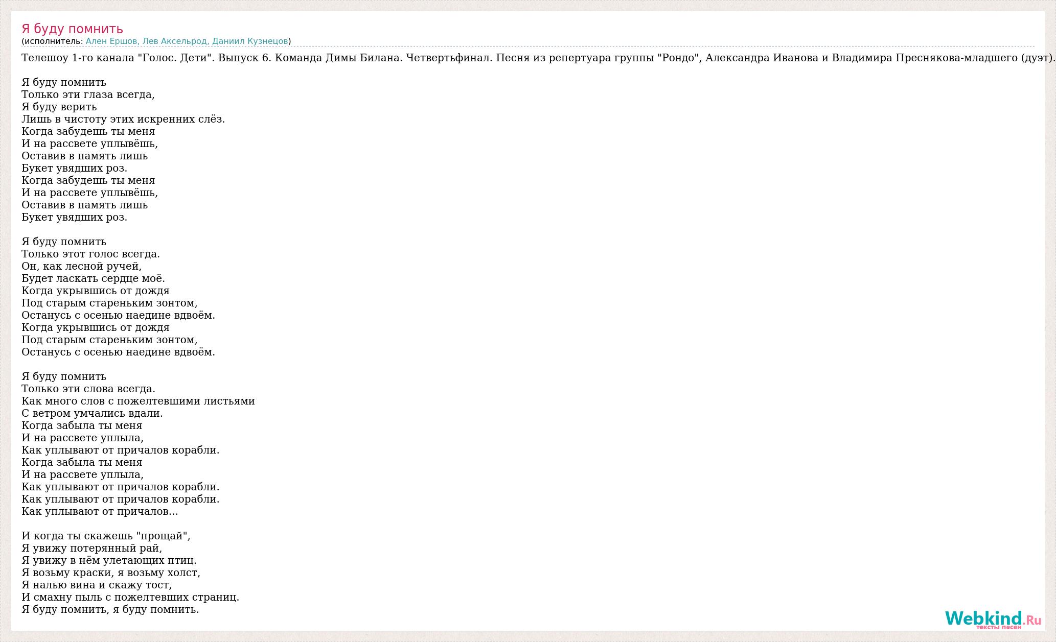 Телешоу 1-го канала "Голос. Дети". Выпуск 6. Команда Димы Билана. Четвертьфинал. Песня из репертуара группы "Рондо", Александра Иванова и Владимира Преснякова-младшего (дуэт). Я буду помнить Только эти глаза всегда, Я буду верить Лишь в чистоту этих искренних слёз. Когда забудешь ты меня И на рассвете уплывёшь, Оставив в память лишь Букет увядших роз. Когда забудешь ты меня И на рассвете уплывёшь, Оставив в память лишь Букет увядших роз. Я буду помнить Только этот голос всегда. Он, как лесной ручей, Будет ласкать сердце моё. Когда укрывшись от дождя Под старым стареньким зонтом, Останусь с осенью наедине вдвоём. Когда укрывшись от дождя Под старым стареньким зонтом, Останусь с осенью наедине вдвоём. Я буду помнить Только эти слова всегда. Как много слов с пожелтевшими листьями С ветром умчались вдали. Когда забыла ты меня И на рассвете уплыла, Как уплывают от причалов корабли. Когда забыла ты меня И на рассвете уплыла, Как уплывают от причалов корабли. Как уплывают от причалов корабли. Как уплывают от причалов... И когда ты скажешь "прощай", Я увижу потерянный рай, Я увижу в нём улетающих птиц. Я возьму краски, я возьму холст, Я налью вина и скажу тост, И смахну пыль с пожелтевших страниц. Я буду помнить, я буду помнить.