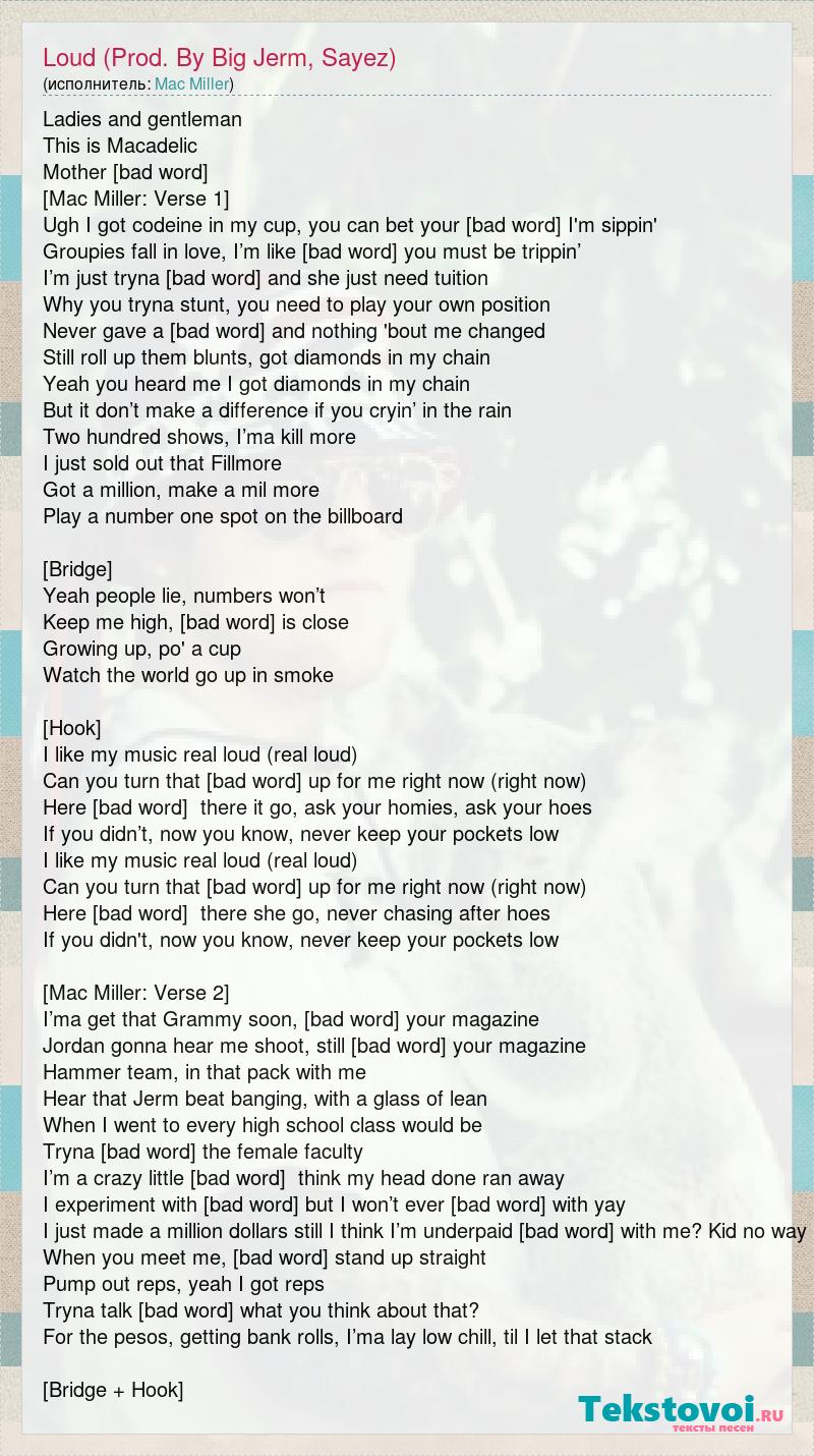 Ladies and gentleman This is Macadelic Mother [bad word] [Mac Miller: Verse 1] Ugh I got codeine in my cup, you can bet your [bad word] I'm sippin' Groupies fall in love, I’m like [bad word] you must be trippin’ I’m just tryna [bad word] and she just need tuition Why you tryna stunt, you need to play your own position Never gave a [bad word] and nothing 'bout me changed Still roll up them blunts, got diamonds in my chain Yeah you heard me I got diamonds in my chain But it don’t make a difference if you cryin’ in the rain Two hundred shows, I’ma kill more I just sold out that Fillmore Got a million, make a mil more Play a number one spot on the billboard [Bridge] Yeah people lie, numbers won’t Keep me high, drugs is close Growing up, po' a cup Watch the world go up in smoke [Hook] I like my music real loud (real loud) Can you turn that [bad word] up for me right now (right now) Here it come, there it go, ask your homies, ask your hoes If you didn’t, now you know, never keep your pockets low I like my music real loud (real loud) Can you turn that [bad word] up for me right now (right now) Here she comes, there she go, never chasing after hoes If you didn't, now you know, never keep your pockets low [Mac Miller: Verse 2] I’ma get that Grammy soon, [bad word] your magazine Jordan gonna hear me shoot, still [bad word] your magazine Hammer team, in that pack with me Hear that Jerm beat banging, with a glass of lean When I went to every high school class would be Tryna [bad word] the female faculty I’m a crazy little [bad word] think my head done ran away I experiment with drugs but I won’t ever [bad word] with yay I just made a million dollars still I think I’m underpaid [bad word] with me? Kid no way When you meet me, [bad word] stand up straight Pump out reps, yeah I got reps Tryna talk [bad word] what you think about that? For the pesos, getting bank rolls, I’ma lay low chill, til I let that stack [Bridge + Hook]