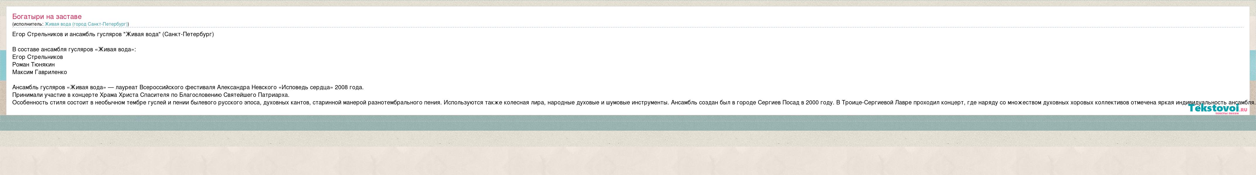 Егор Стрельников и ансамбль гусляров "Живая вода" (Санкт-Петербург) В составе ансамбля гусляров «Живая вода»: Егор Стрельников Роман Тюнякин Максим Гавриленко Ансамбль гусляров «Живая вода» — лауреат Всероссийского фестиваля Александра Невского «Исповедь сердца» 2008 года. Принимали участие в концерте Храма Христа Спасителя по Благословению Святейшего Патриарха. Особенность стиля состоит в необычном тембре гуслей и пении былевого русского эпоса, духовных кантов, старинной манерой разнотембрального пения. Используются также колесная лира, народные духовые и шумовые инструменты. Ансамбль создан был в городе Сергиев Посад в 2000 году. В Троице-Сергиевой Лавре проходил концерт, где наряду со множеством духовных хоровых коллективов отмечена яркая индивидуальность ансамбля.