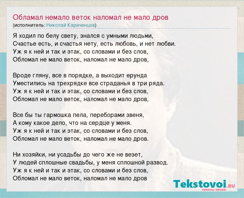 Я ходил по белу свету, знался с умными людьми, Счастье есть, и счастья нету, есть любовь, и нет любви. Уж я к ней и так и этак, со словами и без слов, Обломал не мало веток, наломал не мало дров, Вроде гляну, все в порядке, а выходит ерунда Уместились на трехрядке все страданья в три ряда. Уж я к ней и так и этак, со словами и без слов, Обломал не мало веток, наломал не мало дров, Все бы ты гармошка пела, переборами звеня, А кому какое дело, что на сердце у меня. Уж я к ней и так и этак, со словами и без слов, Обломал не мало веток, наломал не мало дров. Ни хозяйки, ни усадьбы до чего же не везет, У людей сплошные свадьбы, у меня сплошной развод. Уж я к ней и так и этак, со словами и без слов, Обломал не мало веток, наломал не мало дров
