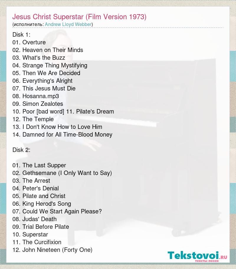 Disk 1: 01. Overture 02. Heaven on Their Minds 03. What's the Buzz 04. Strange Thing Mystifying 05. Then We Are Decided 06. Everything's Alright 07. This Jesus Must Die 08. Hosanna.mp3 09. Simon Zealotes 10. Poor Jerusalem 11. Pilate's Dream 12. The Temple 13. I Don't Know How to Love Him 14. Damned for All Time-Blood Money Disk 2: 01. The Last Supper 02. Gethsemane (I Only Want to Say) 03. The Arrest 04. Peter's Denial 05. Pilate and Christ 06. King Herod's Song 07. Could We Start Again Please? 08. Judas' Death 09. Trial Before Pilate 10. Superstar 11. The Curcifixion 12. John Nineteen (Forty One)