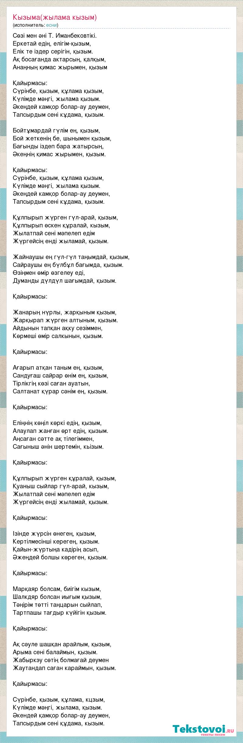 Сөзі мен әні Т. Иманбековтікі. Еркетай едің, елігім-қызым, Елік те іздер серігін, қызым. Ақ босағанда актарсың, қалқым, Анаңның қимас жырымен, қызым Қайырмасы: Сүрінбе, қызым, құлама қызым, Күлімде мәңгі, жылама қызым. Әкеңдей камқор болар-ау деумен, Тапсырдым сені кұдама, қызым. Бойтұмардай гүлім ең, қызым, Бой жеткенің бе, шынымен қызым, Бағынды іздеп бара жатырсың, Әкеңнің қимас жырымен, қызым. Қайырмасы: Сүрінбе, қызым, құлама қызым, Күлімде мәңгі, жылама қызым. Әкеңдей камқор болар-ау деумен, Тапсырдым сені кұдама, қызым. Құлпырып жүрген гүл-арай, қызым, Құлпырып өскен құралай, кызым, Жылатпай сені мәпелеп едім Жүргейсің енді жыламай, қызым. Жайнаушы ең гүл-гүл таңымдай, қызым, Сайраушы ең бүлбұл бағымда, қызым. Өзіңмен өмір өзгелеу еді, Думанды дүлдүл шағымдай, қызым. Қайырмасы: Жанарың нүрлы, жарқыным қызым, Жарқырап жүрген алтыным, қызым. Айдынын тапқан ақку сезіммен, Көрмеші өмір салкынын, қызым. Қайырмасы: Ағарып атқан таным ең, қызым, Сандуғаш сайрар өнім ең, қызым, Тірлікгің көзі саған ауатын, Салтанат қүрар сәнім ең, қызым. Қайырмасы: Еліңнің көңіл көркі едің, қызым, Алаулап жанған өрт едің, қызым. Аңсаған сәтте ақ тілегіммен, Сағыныш әнін шертемін, кьізым. Қайырмасы: Құлпырып жүрген құралай, қызым, Қуаныш сыйлар гүл-арай, кызым, Жылатпай сені мәпелеп едім Жүргейсің енді жыламай, қызым. Қайырмасы: Ізінде жүрсін өнегең, қызым, Кертілмесінші керегең, қызым. Қайын-жүртыңа кадірің асып, Әжеңдей болшы көреген, қызым. Қайырмасы: Марқаяр болсам, биігім кызым, Шалкдяр болсан иығым қызым, Тәңірім төтті таңцарын сыйлап, Тартпашы тағдыр күйігін қызым. Қайырмасы: Ақ сәуле шашқан арайлым, қызым, Арыма сені балаймын, қызым. Жабыркэу сөтің болмағай деумен Жаутандап саған караймын, қызым. Қайырмасы: Сүрінбе, қызым, құлама, кцзым, Күлімде мәңгі, жылама, қызым. Әкендей қамқор болар-ау деумен, Тапсырдым сені құдама, кызым.