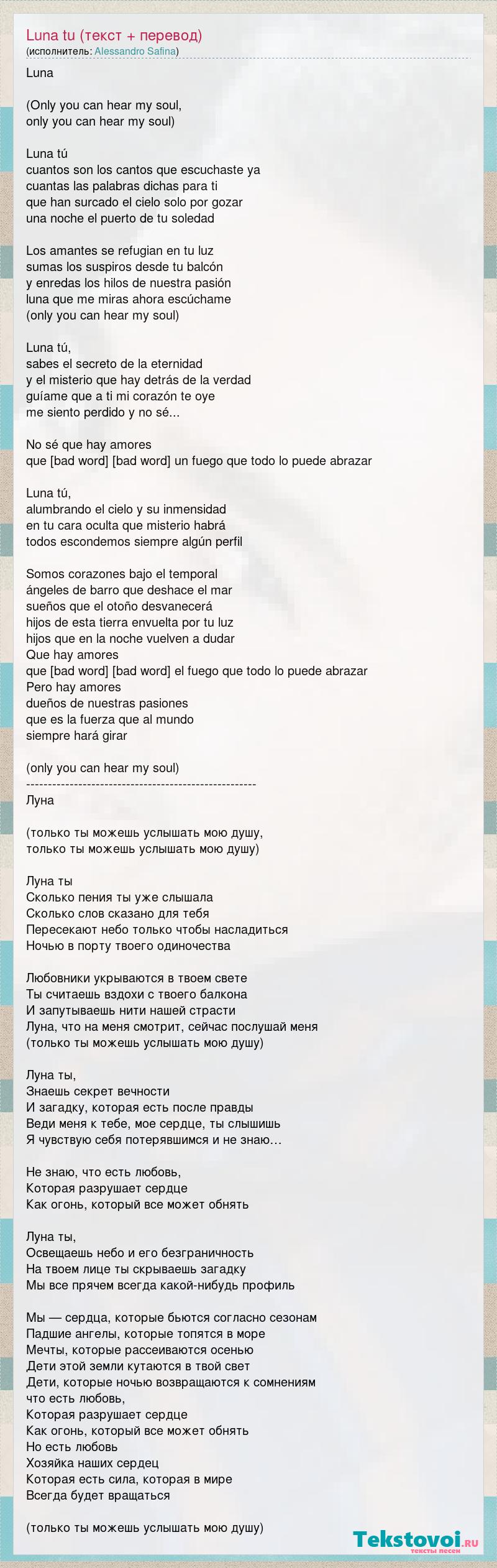 Luna (Only you can hear my soul, only you can hear my soul) Luna tú cuantos son los cantos que escuchaste ya cuantas las palabras dichas para ti que han surcado el cielo solo por gozar una noche el puerto de tu soledad Los amantes se refugian en tu luz sumas los suspiros desde tu balcón y enredas los hilos de nuestra pasión luna que me miras ahora escúchame (only you can hear my soul) Luna tú, sabes el secreto de la eternidad y el misterio que hay detrás de la verdad guíame que a ti mi corazón te oye me siento perdido y no sé... No sé que hay amores que destruyen corazones como un fuego que todo lo puede abrazar Luna tú, alumbrando el cielo y su inmensidad en tu cara oculta que misterio habrá todos escondemos siempre algún perfil Somos corazones bajo el temporal ángeles de barro que deshace el mar sueños que el otoño desvanecerá hijos de esta tierra envuelta por tu luz hijos que en la noche vuelven a dudar Que hay amores que destruyen corazones como el fuego que todo lo puede abrazar Pero hay amores dueños de nuestras pasiones que es la fuerza que al mundo siempre hará girar (only you can hear my soul) ----------------------------------------------------- Луна (только ты можешь услышать мою душу, только ты можешь услышать мою душу) Луна ты Сколько пения ты уже слышала Сколько слов сказано для тебя Пересекают небо только чтобы насладиться Ночью в порту твоего одиночества Любовники укрываются в твоем свете Ты считаешь вздохи с твоего балкона И запутываешь нити нашей страсти Луна, что на меня смотрит, сейчас послушай меня (только ты можешь услышать мою душу) Луна ты, Знаешь секрет вечности И загадку, которая есть после правды Веди меня к тебе, мое сердце, ты слышишь Я чувствую себя потерявшимся и не знаю… Не знаю, что есть любовь, Которая разрушает сердце Как огонь, который все может обнять Луна ты, Освещаешь небо и его безграничность На твоем лице ты скрываешь загадку Мы все прячем всегда какой-нибудь профиль Мы — сердца, которые бьются согласно сезонам Падшие ангелы, которые топятся в море Мечты, которые рассеиваются осенью Дети этой земли кутаются в твой свет Дети, которые ночью возвращаются к сомнениям что есть любовь, Которая разрушает сердце Как огонь, который все может обнять Но есть любовь Хозяйка наших сердец Которая есть сила, которая в мире Всегда будет вращаться (только ты можешь услышать мою душу)