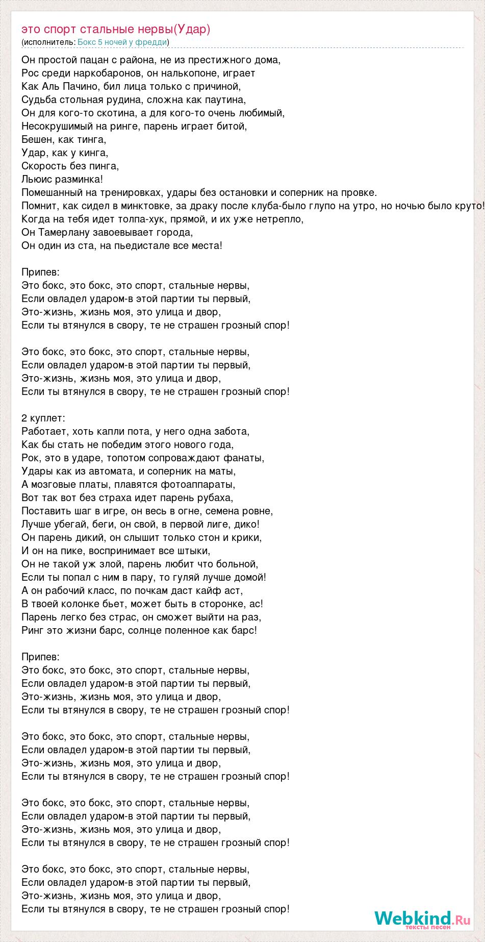 Он простой пацан с района, не из престижного дома, Рос среди наркобаронов, он налькопоне, играет Как Аль Пачино, бил лица только с причиной, Судьба стольная рудина, сложна как паутина, Он для кого-то скотина, а для кого-то очень любимый, Несокрушимый на ринге, парень играет битой, Бешен, как тинга, Удар, как у кинга, Скорость без пинга, Льюис разминка! Помешанный на тренировках, удары без остановки и соперник на провке. Помнит, как сидел в минктовке, за драку после клуба-было глупо на утро, но ночью было круто! Когда на тебя идет толпа-хук, прямой, и их уже нетрепло, Он Тамерлану завоевывает города, Он один из ста, на пьедистале все места! Припев: Это бокс, это бокс, это спорт, стальные нервы, Если овладел ударом-в этой партии ты первый, Это-жизнь, жизнь моя, это улица и двор, Если ты втянулся в свору, те не страшен грозный спор! Это бокс, это бокс, это спорт, стальные нервы, Если овладел ударом-в этой партии ты первый, Это-жизнь, жизнь моя, это улица и двор, Если ты втянулся в свору, те не страшен грозный спор! 2 куплет: Работает, хоть капли пота, у него одна забота, Как бы стать не победим этого нового года, Рок, это в ударе, топотом сопроваждают фанаты, Удары как из автомата, и соперник на маты, А мозговые платы, плавятся фотоаппараты, Вот так вот без страха идет парень рубаха, Поставить шаг в игре, он весь в огне, семена ровне, Лучше убегай, беги, он свой, в первой лиге, дико! Он парень дикий, он слышит только стон и крики, И он на пике, воспринимает все штыки, Он не такой уж злой, парень любит что больной, Если ты попал с ним в пару, то гуляй лучше домой! А он рабочий класс, по почкам даст кайф аст, В твоей колонке бьет, может быть в сторонке, ас! Парень легко без страс, он сможет выйти на раз, Ринг это жизни барс, солнце поленное как барс! Припев: Это бокс, это бокс, это спорт, стальные нервы, Если овладел ударом-в этой партии ты первый, Это-жизнь, жизнь моя, это улица и двор, Если ты втянулся в свору, те не страшен грозный спор! Это бокс, это бокс, это спорт, стальные нервы, Если овладел ударом-в этой партии ты первый, Это-жизнь, жизнь моя, это улица и двор, Если ты втянулся в свору, те не страшен грозный спор! Это бокс, это бокс, это спорт, стальные нервы, Если овладел ударом-в этой партии ты первый, Это-жизнь, жизнь моя, это улица и двор, Если ты втянулся в свору, те не страшен грозный спор! Это бокс, это бокс, это спорт, стальные нервы, Если овладел ударом-в этой партии ты первый, Это-жизнь, жизнь моя, это улица и двор, Если ты втянулся в свору, те не страшен грозный спор!