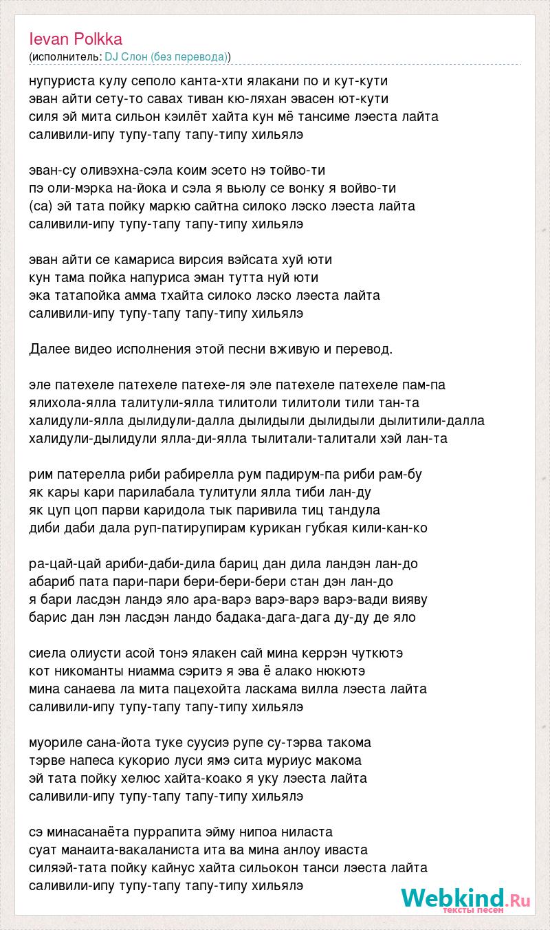 нупуриста кулу сеполо канта-хти ялакани по и кут-кути эван айти сету-то савах тиван кю-ляхан эвасен ют-кути силя эй мита сильон кэилёт хайта кун мё тансиме лэеста лайта саливили-ипу тупу-тапу тапу-типу хильялэ эван-су оливэхна-сэла коим эсето нэ тойво-ти пэ оли-мэрка на-йока и сэла я вьюлу се вонку я войво-ти (са) эй тата пойку маркю сайтна силоко лэско лэеста лайта саливили-ипу тупу-тапу тапу-типу хильялэ эван айти се камариса вирсия вэйсата хуй юти кун тама пойка напуриса эман тутта нуй юти эка татапойка амма тхайта силоко лэско лэеста лайта саливили-ипу тупу-тапу тапу-типу хильялэ Далее видео исполнения этой песни вживую и перевод. эле патехеле патехеле патехе-ля эле патехеле патехеле пам-па ялихола-ялла талитули-ялла тилитоли тилитоли тили тан-та халидули-ялла дылидули-далла дылидыли дылидыли дылитили-далла халидули-дылидули ялла-ди-ялла тылитали-талитали хэй лан-та рим патерелла риби рабирелла рум падирум-па риби рам-бу як кары кари парилабала тулитули ялла тиби лан-ду як цуп цоп парви каридола тык паривила тиц тандула диби даби дала руп-патирупирам курикан губкая кили-кан-ко ра-цай-цай ариби-даби-дила бариц дан дила ландэн лан-до абариб пата пари-пари бери-бери-бери стан дэн лан-до я бари ласдэн ландэ яло ара-варэ варэ-варэ варэ-вади вияву барис дан лэн ласдэн ландо бадака-дага-дага ду-ду де яло сиела олиусти асой тонэ ялакен сай мина керрэн чуткютэ кот никоманты ниамма сэритэ я эва ё алако нюкютэ мина санаева ла мита пацехойта ласкама вилла лэеста лайта саливили-ипу тупу-тапу тапу-типу хильялэ муориле сана-йота туке суусиэ рупе су-тэрва такома тэрве напеса кукорио луси ямэ сита муриус макома эй тата пойку хелюс хайта-коако я уку лэеста лайта саливили-ипу тупу-тапу тапу-типу хильялэ сэ минасанаёта пуррапита эйму нипоа ниласта суат манаита-вакаланиста ита ва мина анлоу иваста силяэй-тата пойку кайнус хайта сильокон танси лэеста лайта саливили-ипу тупу-тапу тапу-типу хильялэ