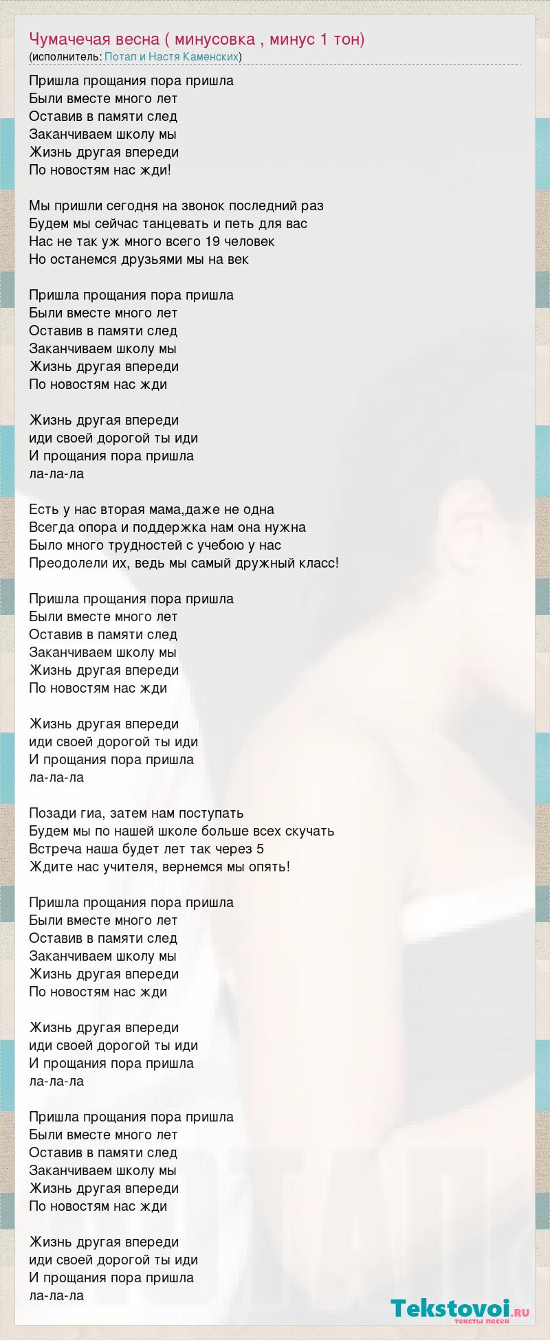 Пришла прощания пора пришла Были вместе много лет Оставив в памяти след Заканчиваем школу мы Жизнь другая впереди По новостям нас жди! Мы пришли сегодня на звонок последний раз Будем мы сейчас танцевать и петь для вас Нас не так уж много всего 19 человек Но останемся друзьями мы на век Пришла прощания пора пришла Были вместе много лет Оставив в памяти след Заканчиваем школу мы Жизнь другая впереди По новостям нас жди Жизнь другая впереди иди своей дорогой ты иди И прощания пора пришла ла-ла-ла Есть у нас вторая мама,даже не одна Всегда опора и поддержка нам она нужна Было много трудностей с учебою у нас Преодолели их, ведь мы самый дружный класс! Пришла прощания пора пришла Были вместе много лет Оставив в памяти след Заканчиваем школу мы Жизнь другая впереди По новостям нас жди Жизнь другая впереди иди своей дорогой ты иди И прощания пора пришла ла-ла-ла Позади гиа, затем нам поступать Будем мы по нашей школе больше всех скучать Встреча наша будет лет так через 5 Ждите нас учителя, вернемся мы опять! Пришла прощания пора пришла Были вместе много лет Оставив в памяти след Заканчиваем школу мы Жизнь другая впереди По новостям нас жди Жизнь другая впереди иди своей дорогой ты иди И прощания пора пришла ла-ла-ла Пришла прощания пора пришла Были вместе много лет Оставив в памяти след Заканчиваем школу мы Жизнь другая впереди По новостям нас жди Жизнь другая впереди иди своей дорогой ты иди И прощания пора пришла ла-ла-ла