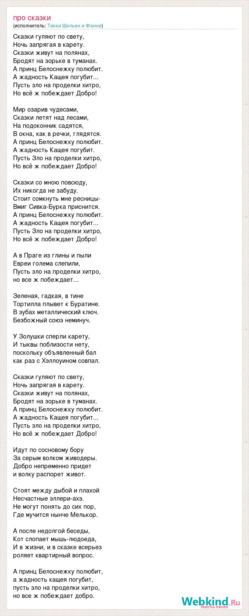 Сказки гуляют по свету, Ночь запрягая в карету. Сказки живут на полянах, Бродят на зорьке в туманах. А принц Белоснежку полюбит. А жадность Кащея погубит... Пусть зло на проделки хитро, Но всё ж побеждает Добро! Мир озарив чудесами, Сказки летят над лесами, На подоконник садятся, В окна, как в речки, глядятся. А принц Белоснежку полюбит. А жадность Кащея погубит. Пусть Зло на проделки хитро, Но всё ж побеждает Добро! Сказки со мною повсюду, Их никогда не забуду. Стоит сомкнуть мне ресницы- Вмиг Сивка-Бурка приснится. А принц Белоснежку полюбит. А жадность Кащея погубит... Пусть Зло на проделки хитро, Но всё ж побеждает Добро! А в Праге из глины и пыли Евреи голема слепили, Пусть зло на проделки хитро, но все ж побеждает... Зеленая, гадкая, в тине Тортилла плывет к Буратине. В зубах металлический ключ. Безбожный союз неминуч. У Золушки сперли карету, И тыквы поблизости нету, поскольку объявленный бал как раз с Хэллоуином совпал. Сказки гуляют по свету, Ночь запрягая в карету. Сказки живут на полянах, Бродят на зорьке в туманах. А принц Белоснежку полюбит. А жадность Кащея погубит... Пусть зло на проделки хитро, Но всё ж побеждает Добро! Идут по сосновому бору За серым волком живодеры. Добро непременно придет и волку распорет живот. Стоят между дыбой и плахой Несчастные эллери-ахэ. Не могут понять до сих пор, Где мучится нынче Мелькор. А после недолгой беседы, Кот слопает мышь-людоеда, И в жизни, и в сказке всерьез роляет квартирный вопрос. А принц Белоснежку полюбит, а жадность кащея погубит, пусть зло на проделки хитро, но все ж побеждает добро.