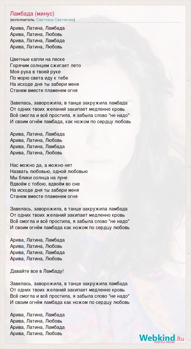 Арива, Латина, Ламбада Арива, Латина, Любовь Арива, Латина, Ламбада Арива, Латина, Любовь Цветные капли на песке Горячим солнцем сжигает лето Моя рука в твоей руке По морю света иду к тебе На исходе дня ты забери меня Станем вместе пламенем огня Завелась, заворожила, в танце закружила ламбада От одних твоих желаний закипает медленно кровь Всё смогла и всё простила, я забыла слово "не надо" И своим огнём ламбада, как ножом по сердцу любовь Арива, Латина, Ламбада Арива, Латина, Любовь Арива, Латина, Ламбада Арива, Латина, Любовь Нас можно да, а можно нет Назвать любовью, одной любовью Мы блики солнца на луне Вдвоём с тобою, вдвоём во сне На исходе дня ты забери меня Станем вместе пламенем огня Завелась, заворожила, в танце закружила ламбада От одних твоих желаний закипает медленно кровь Всё смогла и всё простила, я забыла слово "не надо" И своим огнём ламбада как ножом по сердцу любовь Арива, Латина, Ламбада Арива, Латина, Любовь Арива, Латина, Ламбада Арива, Латина, Любовь Давайте все в Ламбаду! Завелась, заворожила, в танце закружила ламбада От одних твоих желаний закипает медленно кровь Всё смогла и всё простила, я забыла слово "не надо" И своим огнём ламбада как ножом по сердцу любовь Арива, Латина, Ламбада Арива, Латина, Любовь Арива, Латина, Ламбада Арива, Латина, Любовь
