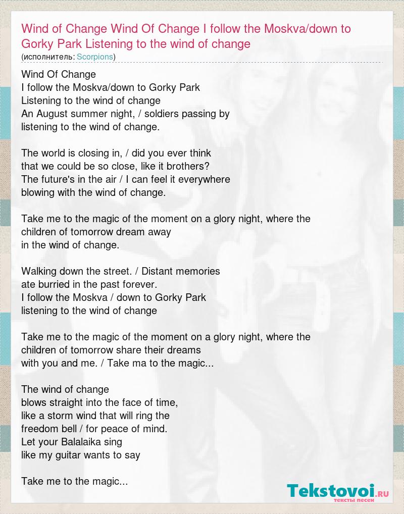 Wind Of Change I follow the Moskva/down to Gorky Park Listening to the wind of change An August summer night, / soldiers passing by listening to the wind of change. The world is closing in, / did you ever think that we could be so close, like it brothers? The future's in the air / I can feel it everywhere blowing with the wind of change. Take me to the magic of the moment on a glory night, where the children of tomorrow dream away in the wind of change. Walking down the street. / Distant memories ate burried in the past forever. I follow the Moskva / down to Gorky Park listening to the wind of change Take me to the magic of the moment on a glory night, where the children of tomorrow share their dreams with you and me. / Take ma to the magic... The wind of change blows straight into the face of time, like a storm wind that will ring the freedom bell / for peace of mind. Let your Balalaika sing like my guitar wants to say Take me to the magic...