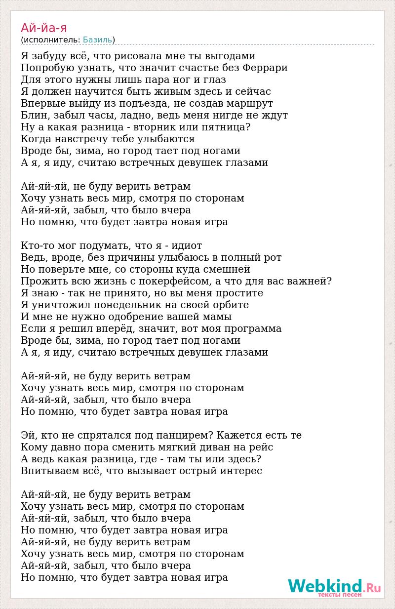 Я забуду всё, что рисовала мне ты выгодами Попробую узнать, что значит счастье без Феррари Для этого нужны лишь пара ног и глаз Я должен научится быть живым здесь и сейчас Впервые выйду из подъезда, не создав маршрут Блин, забыл часы, ладно, ведь меня нигде не ждут Ну а какая разница - вторник или пятница? Когда навстречу тебе улыбаются Вроде бы, зима, но город тает под ногами А я, я иду, считаю встречных девушек глазами Ай-яй-яй, не буду верить ветрам Хочу узнать весь мир, смотря по сторонам Ай-яй-яй, забыл, что было вчера Но помню, что будет завтра новая игра Кто-то мог подумать, что я - идиот Ведь, вроде, без причины улыбаюсь в полный рот Но поверьте мне, со стороны куда смешней Прожить всю жизнь с покерфейсом, а что для вас важней? Я знаю - так не принято, но вы меня простите Я уничтожил понедельник на своей орбите И мне не нужно одобрение вашей мамы Если я решил вперёд, значит, вот моя программа Вроде бы, зима, но город тает под ногами А я, я иду, считаю встречных девушек глазами Ай-яй-яй, не буду верить ветрам Хочу узнать весь мир, смотря по сторонам Ай-яй-яй, забыл, что было вчера Но помню, что будет завтра новая игра Эй, кто не спрятался под панцирем? Кажется есть те Кому давно пора сменить мягкий диван на рейс А ведь какая разница, где - там ты или здесь? Впитываем всё, что вызывает острый интерес Ай-яй-яй, не буду верить ветрам Хочу узнать весь мир, смотря по сторонам Ай-яй-яй, забыл, что было вчера Но помню, что будет завтра новая игра Ай-яй-яй, не буду верить ветрам Хочу узнать весь мир, смотря по сторонам Ай-яй-яй, забыл, что было вчера Но помню, что будет завтра новая игра