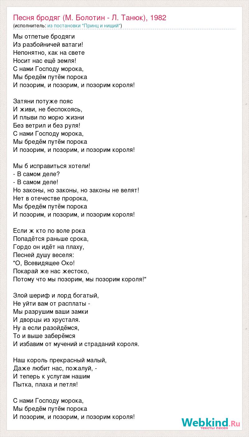 Мы отпетые бродяги Из разбойничей ватаги! Непонятно, как на свете Носит нас ещё земля! С нами Господу морока, Мы бредём путём порока И позорим, и позорим, и позорим короля! Затяни потуже пояс И живи, не беспокоясь, И плыви по морю жизни Без ветрил и без руля! С нами Господу морока, Мы бредём путём порока И позорим, и позорим, и позорим короля! Мы б исправиться хотели! - В самом деле? - В самом деле! Но законы, но законы, но законы не велят! Нет в отечестве пророка, Мы бредём путём порока И позорим, и позорим, и позорим короля! Если ж кто по воле рока Попадётся раньше срока, Гордо он идёт на плаху, Песней душу веселя: "О, Всевидящее Око! Покарай же нас жестоко, Потому что мы позорим, мы позорим короля!" Злой шериф и лорд богатый, Не уйти вам от расплаты - Мы разрушим ваши замки И дворцы из хрусталя. Ну а если разойдёмся, То и выше заберёмся И избавим от мучений и страданий короля. Наш король прекрасный малый, Даже любит нас, пожалуй, - И теперь к услугам нашим Пытка, плаха и петля! С нами Господу морока, Мы бредём путём порока И позорим, и позорим, и позорим короля!