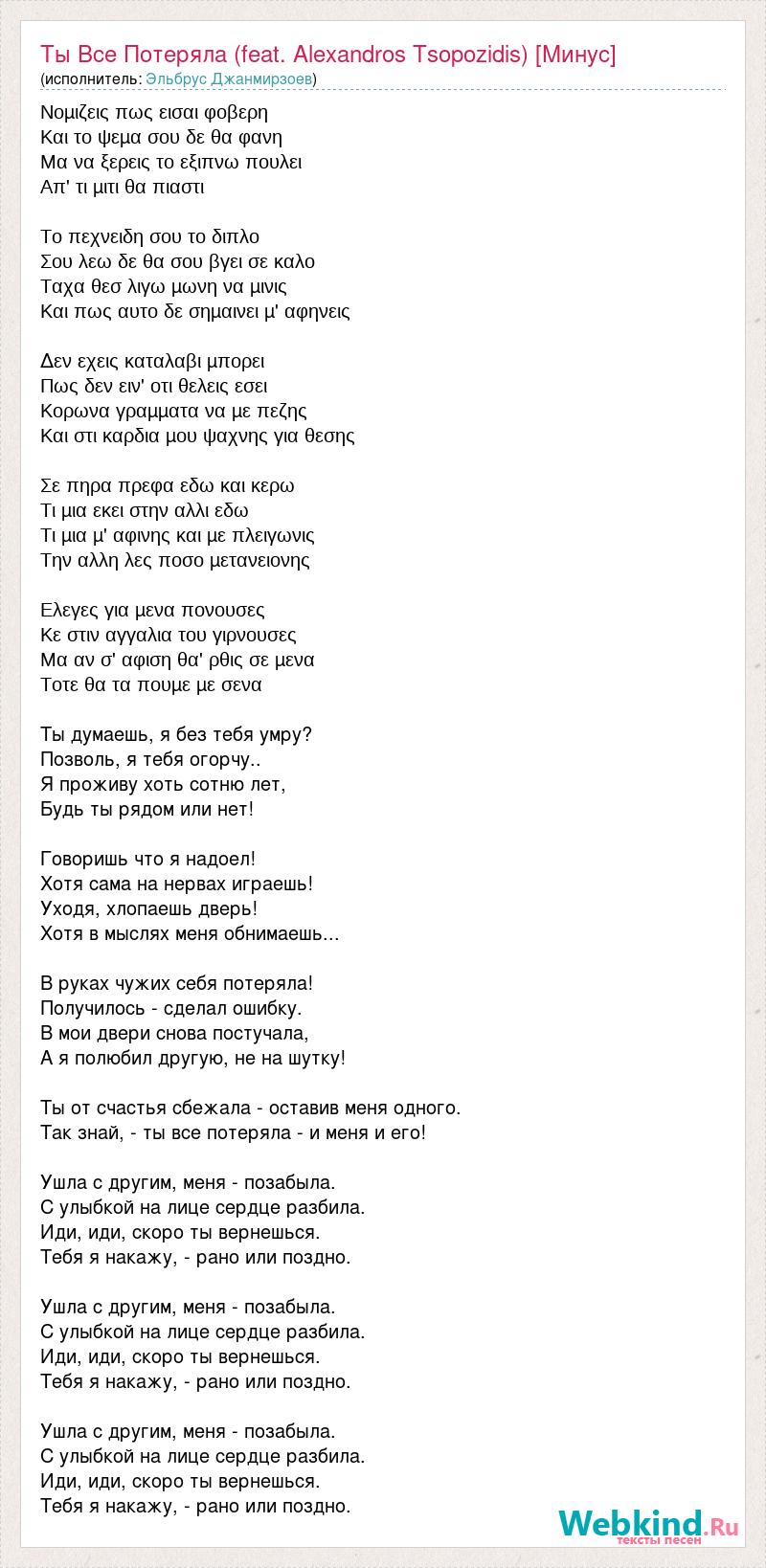 Νομιζεις πως εισαι φοβερη Και το ψεμα σου δε θα φανη Μα να ξερεις το εξιπνω πουλει Απ' τι μιτι θα πιαστι Το πεχνειδη σου το διπλο Σου λεω δε θα σου βγει σε καλο Ταχα θεσ λιγω μωνη να μινις Και πως αυτο δε σημαινει μ' αφηνεις Δεν εχεις καταλαβι μπορει Πως δεν ειν' οτι θελεις εσει Κορωνα γραμματα να με πεζης Και στι καρδια μου ψαχνης για θεσης Σε πηρα πρεφα εδω και κερω Τι μια εκει στην αλλι εδω Τι μια μ' αφινης και με πλειγωνις Την αλλη λες ποσο μετανειονης Ελεγες για μενα πονουσες Κε στιν αγγαλια του γιρνουσες Μα αν σ' αφιση θα' ρθις σε μενα Τοτε θα τα πουμε με σενα Ты думаешь, я без тебя умру? Позволь, я тебя огорчу.. Я проживу хоть сотню лет, Будь ты рядом или нет! Говоришь что я надоел! Хотя сама на нервах играешь! Уходя, хлопаешь дверь! Хотя в мыслях меня обнимаешь... В руках чужих себя потеряла! Получилось - сделал ошибку. В мои двери снова постучала, А я полюбил другую, не на шутку! Ты от счастья сбежала - оставив меня одного. Так знай, - ты все потеряла - и меня и его! Ушла с другим, меня - позабыла. С улыбкой на лице сердце разбила. Иди, иди, скоро ты вернешься. Тебя я накажу, - рано или поздно. Ушла с другим, меня - позабыла. С улыбкой на лице сердце разбила. Иди, иди, скоро ты вернешься. Тебя я накажу, - рано или поздно. Ушла с другим, меня - позабыла. С улыбкой на лице сердце разбила. Иди, иди, скоро ты вернешься. Тебя я накажу, - рано или поздно.