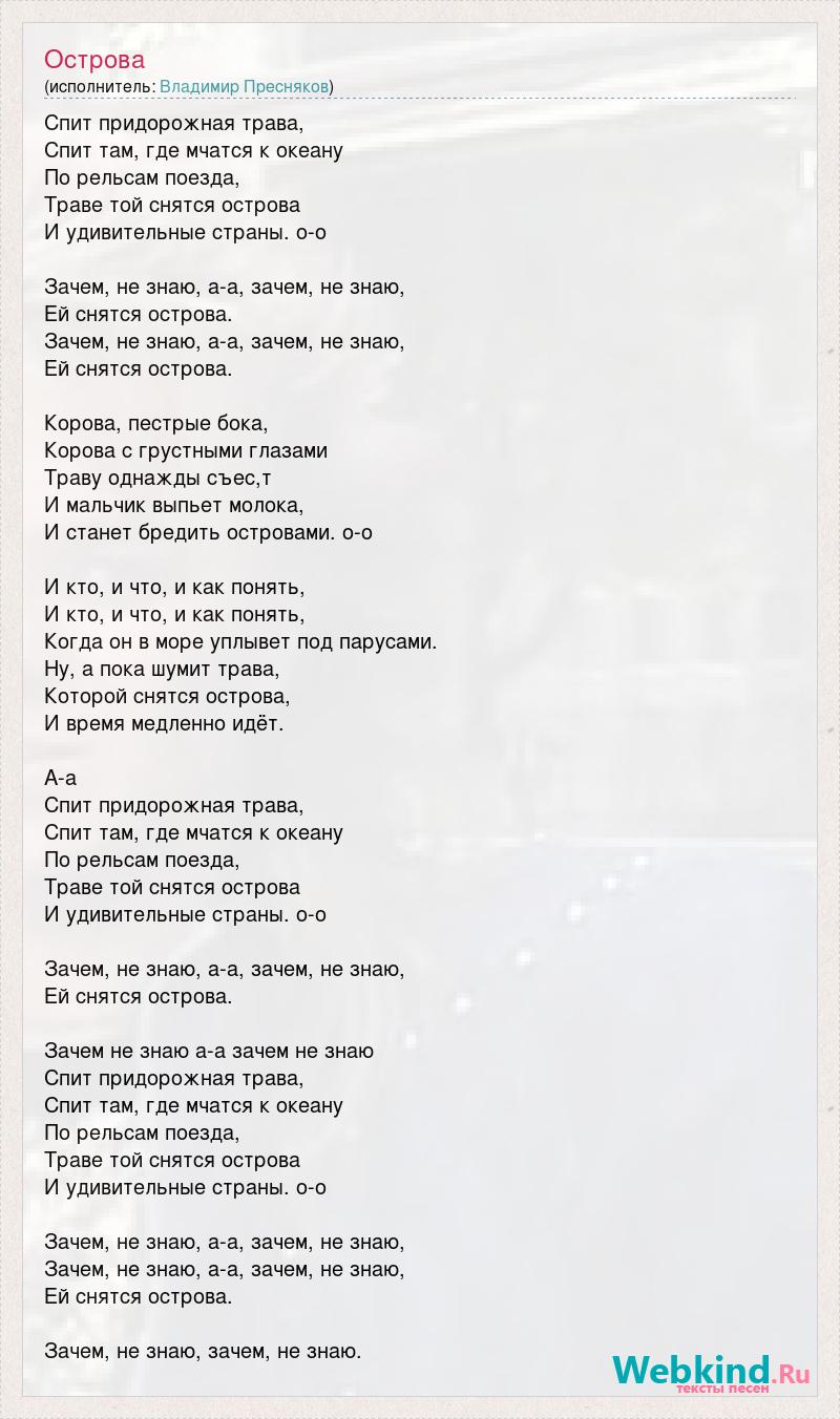 Спит придорожная трава, Спит там, где мчатся к океану По рельсам поезда, Траве той снятся острова И удивительные страны. о-о Зачем, не знаю, а-а, зачем, не знаю, Ей снятся острова. Зачем, не знаю, а-а, зачем, не знаю, Ей снятся острова. Корова, пестрые бока, Корова с грустными глазами Траву однажды съес,т И мальчик выпьет молока, И станет бредить островами. о-о И кто, и что, и как понять, И кто, и что, и как понять, Когда он в море уплывет под парусами. Ну, а пока шумит трава, Которой снятся острова, И время медленно идёт. А-а Спит придорожная трава, Спит там, где мчатся к океану По рельсам поезда, Траве той снятся острова И удивительные страны. о-о Зачем, не знаю, а-а, зачем, не знаю, Ей снятся острова. Зачем не знаю а-а зачем не знаю Спит придорожная трава, Спит там, где мчатся к океану По рельсам поезда, Траве той снятся острова И удивительные страны. о-о Зачем, не знаю, а-а, зачем, не знаю, Зачем, не знаю, а-а, зачем, не знаю, Ей снятся острова. Зачем, не знаю, зачем, не знаю.