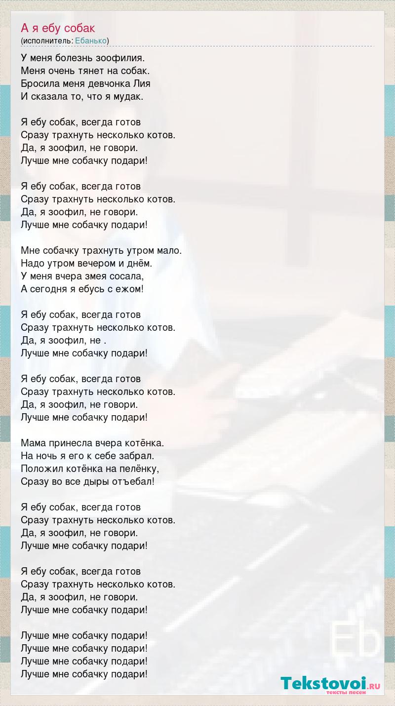 У меня болезнь зоофилия. Меня очень тянет на собак. Бросила меня девчонка Лия И сказала то, что я мудак. Я ебу собак, всегда готов Сразу трахнуть несколько котов. Да, я зоофил, не говори. Лучше мне собачку подари! Я ебу собак, всегда готов Сразу трахнуть несколько котов. Да, я зоофил, не говори. Лучше мне собачку подари! Мне собачку трахнуть утром мало. Надо утром вечером и днём. У меня вчера змея сосала, А сегодня я ебусь с ежом! Я ебу собак, всегда готов Сразу трахнуть несколько котов. Да, я зоофил, не . Лучше мне собачку подари! Я ебу собак, всегда готов Сразу трахнуть несколько котов. Да, я зоофил, не говори. Лучше мне собачку подари! Мама принесла вчера котёнка. На ночь я его к себе забрал. Положил котёнка на пелёнку, Сразу во все дыры отъебал! Я ебу собак, всегда готов Сразу трахнуть несколько котов. Да, я зоофил, не говори. Лучше мне собачку подари! Я ебу собак, всегда готов Сразу трахнуть несколько котов. Да, я зоофил, не говори. Лучше мне собачку подари! Лучше мне собачку подари! Лучше мне собачку подари! Лучше мне собачку подари! Лучше мне собачку подари!