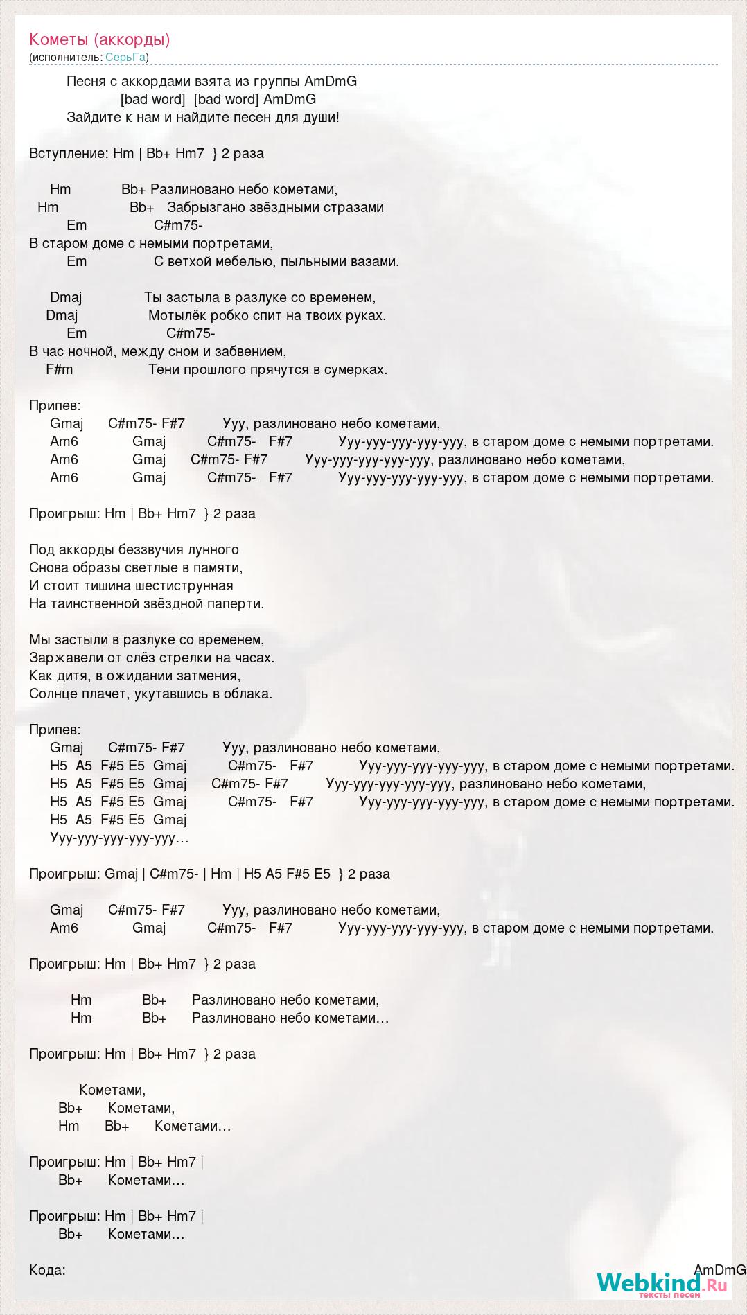 Песня с аккордами взята из группы AmDmG [bad word] [bad word] AmDmG Зайдите к нам и найдите песен для души! Вступление: Hm | Bb+ Hm7 } 2 раза Hm Bb+ Разлиновано небо кометами, Hm Bb+ Забрызгано звёздными стразами Em C#m75- В старом доме с немыми портретами, Em С ветхой мебелью, пыльными вазами. Dmaj Ты застыла в разлуке со временем, Dmaj Мотылёк робко спит на твоих руках. Em C#m75- В час ночной, между сном и забвением, F#m Тени прошлого прячутся в сумерках. Припев: Gmaj C#m75- F#7 Ууу, разлиновано небо кометами, Am6 Gmaj C#m75- F#7 Ууу-ууу-ууу-ууу-ууу, в старом доме с немыми портретами. Am6 Gmaj C#m75- F#7 Ууу-ууу-ууу-ууу-ууу, разлиновано небо кометами, Am6 Gmaj C#m75- F#7 Ууу-ууу-ууу-ууу-ууу, в старом доме с немыми портретами. Проигрыш: Hm | Bb+ Hm7 } 2 раза Под аккорды беззвучия лунного Снова образы светлые в памяти, И стоит тишина шестиструнная На таинственной звёздной паперти. Мы застыли в разлуке со временем, Заржавели от слёз стрелки на часах. Как дитя, в ожидании затмения, Солнце плачет, укутавшись в облака. Припев: Gmaj C#m75- F#7 Ууу, разлиновано небо кометами, H5 A5 F#5 E5 Gmaj C#m75- F#7 Ууу-ууу-ууу-ууу-ууу, в старом доме с немыми портретами. H5 A5 F#5 E5 Gmaj C#m75- F#7 Ууу-ууу-ууу-ууу-ууу, разлиновано небо кометами, H5 A5 F#5 E5 Gmaj C#m75- F#7 Ууу-ууу-ууу-ууу-ууу, в старом доме с немыми портретами. H5 A5 F#5 E5 Gmaj Ууу-ууу-ууу-ууу-ууу… Проигрыш: Gmaj | C#m75- | Hm | H5 A5 F#5 E5 } 2 раза Gmaj C#m75- F#7 Ууу, разлиновано небо кометами, Am6 Gmaj C#m75- F#7 Ууу-ууу-ууу-ууу-ууу, в старом доме с немыми портретами. Проигрыш: Hm | Bb+ Hm7 } 2 раза Hm Bb+ Разлиновано небо кометами, Hm Bb+ Разлиновано небо кометами… Проигрыш: Hm | Bb+ Hm7 } 2 раза Кометами, Bb+ Кометами, Hm Bb+ Кометами… Проигрыш: Hm | Bb+ Hm7 | Bb+ Кометами… Проигрыш: Hm | Bb+ Hm7 | Bb+ Кометами… Кода: AmDmG