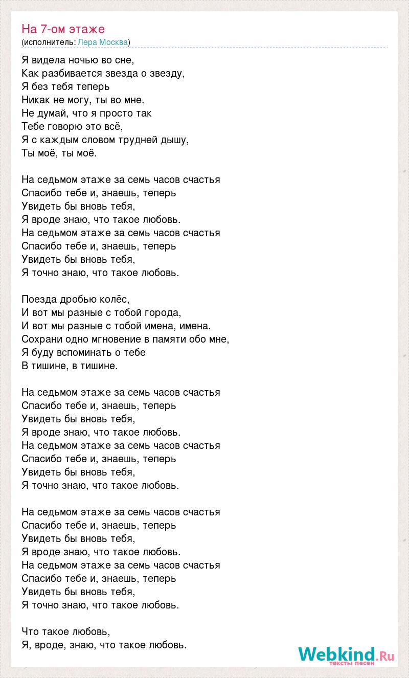 Я видела ночью во сне, Как разбивается звезда о звезду, Я без тебя теперь Никак не могу, ты во мне. Не думай, что я просто так Тебе говорю это всё, Я с каждым словом трудней дышу, Ты моё, ты моё. На седьмом этаже за семь часов счастья Спасибо тебе и, знаешь, теперь Увидеть бы вновь тебя, Я вроде знаю, что такое любовь. На седьмом этаже за семь часов счастья Спасибо тебе и, знаешь, теперь Увидеть бы вновь тебя, Я точно знаю, что такое любовь. Поезда дробью колёс, И вот мы разные с тобой города, И вот мы разные с тобой имена, имена. Сохрани одно мгновение в памяти обо мне, Я буду вспоминать о тебе В тишине, в тишине. На седьмом этаже за семь часов счастья Спасибо тебе и, знаешь, теперь Увидеть бы вновь тебя, Я вроде знаю, что такое любовь. На седьмом этаже за семь часов счастья Спасибо тебе и, знаешь, теперь Увидеть бы вновь тебя, Я точно знаю, что такое любовь. На седьмом этаже за семь часов счастья Спасибо тебе и, знаешь, теперь Увидеть бы вновь тебя, Я вроде знаю, что такое любовь. На седьмом этаже за семь часов счастья Спасибо тебе и, знаешь, теперь Увидеть бы вновь тебя, Я точно знаю, что такое любовь. Что такое любовь, Я, вроде, знаю, что такое любовь.