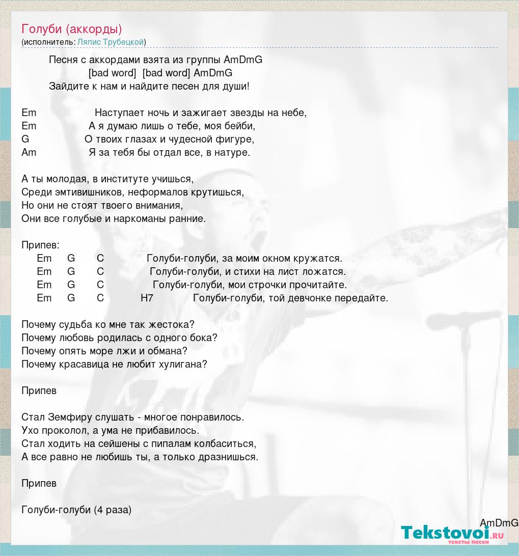 Песня с аккордами взята из группы AmDmG [bad word] [bad word] AmDmG Зайдите к нам и найдите песен для души! Em Наступает ночь и зажигает звезды на небе, Em А я думаю лишь о тебе, моя бейби, G О твоих глазах и чудесной фигуре, Am Я за тебя бы отдал все, в натуре. А ты молодая, в институте учишься, Среди эмтивишников, неформалов крутишься, Но они не стоят твоего внимания, Они все голубые и наркоманы ранние. Припев: Em G C Голуби-голуби, за моим окном кружатся. Em G C Голуби-голуби, и стихи на лист ложатся. Em G C Голуби-голуби, мои строчки прочитайте. Em G C H7 Голуби-голуби, той девчонке передайте. Почему судьба ко мне так жестока? Почему любовь родилась с одного бока? Почему опять море лжи и обмана? Почему красавица не любит хулигана? Припев Стал Земфиру слушать - многое понравилось. Ухо проколол, а ума не прибавилось. Стал ходить на сейшены с пипалам колбаситься, А все равно не любишь ты, а только дразнишься. Припев Голуби-голуби (4 раза) AmDmG