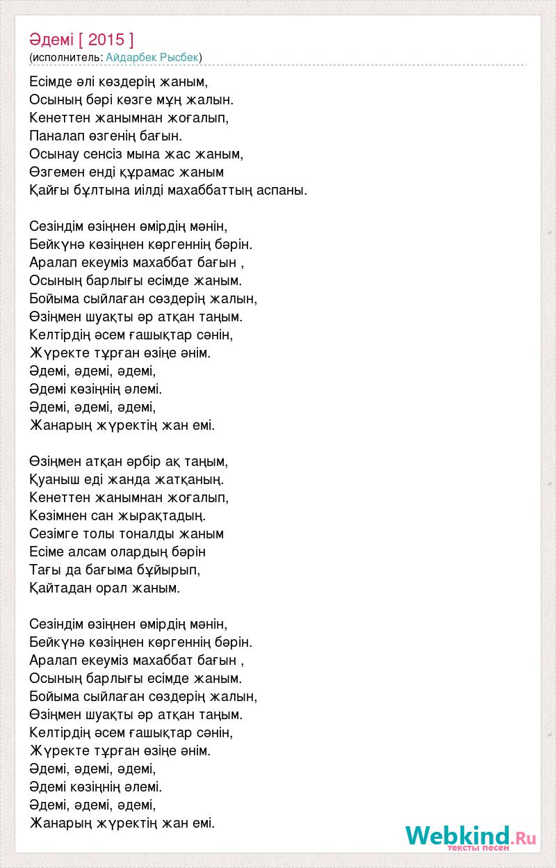 Есімде әлі көздерің жаным, Осының бәрі көзге мұң жалын. Кенеттен жанымнан жоғалып, Паналап өзгенің бағын. Осынау сенсіз мына жас жаным, Өзгемен енді құрамас жаным Қайғы бұлтына иілді махаббаттың аспаны. Сезіндім өзіңнен өмірдің мәнін, Бейкүнә көзіңнен көргеннің бәрін. Аралап екеуміз махаббат бағын , Осының барлығы есімде жаным. Бойыма сыйлаған сөздерің жалын, Өзіңмен шуақты әр атқан таңым. Келтірдің әсем ғашықтар сәнін, Жүректе тұрған өзіңе әнім. Әдемі, әдемі, әдемі, Әдемі көзіңнің әлемі. Әдемі, әдемі, әдемі, Жанарың жүректің жан емі. Өзіңмен атқан әрбір ақ таңым, Қуаныш еді жанда жатқаның. Кенеттен жанымнан жоғалып, Көзімнен сан жырақтадың. Сезімге толы тоналды жаным Есіме алсам олардың бәрін Тағы да бағыма бұйырып, Қайтадан орал жаным. Сезіндім өзіңнен өмірдің мәнін, Бейкүнә көзіңнен көргеннің бәрін. Аралап екеуміз махаббат бағын , Осының барлығы есімде жаным. Бойыма сыйлаған сөздерің жалын, Өзіңмен шуақты әр атқан таңым. Келтірдің әсем ғашықтар сәнін, Жүректе тұрған өзіңе әнім. Әдемі, әдемі, әдемі, Әдемі көзіңнің әлемі. Әдемі, әдемі, әдемі, Жанарың жүректің жан емі.